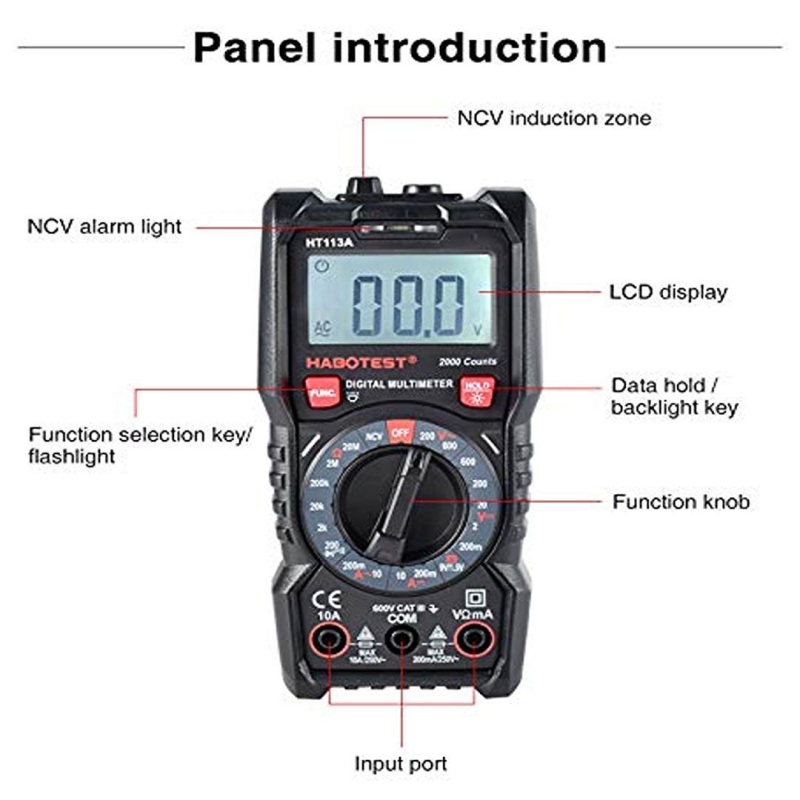 The HABOTEST HT113A 2000 Counts Digital Multimeter is a compact, reliable, and easy-to-use manual-range multimeter designed for everyday electrical testing. It accurately measures AC/DC voltage and current, resistance, and includes essential features like NCV detection, continuity and diode testing, backlit LCD, flashlight, and overload protection—ideal for home users, technicians, and students.