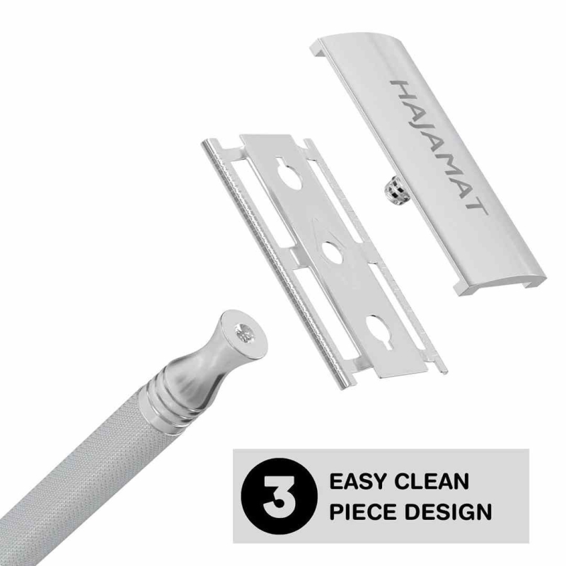 The Hajamat Spade Double Edge Safety Razor is a classic single-blade safety razor with a sleek silver-chrome finish and a traditional 3-piece design. Built for a close, smooth, and irritation-free shave, it’s made with a stainless-steel handle and a precision zinc alloy head. Its non-slip grip and balanced weight make it easy to handle, whether you’re shaving with cream, soap, or foam — ideal for daily grooming or travel use.
