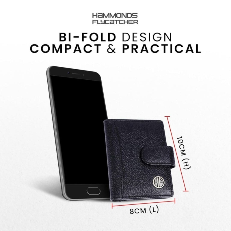 The HAMMONDS FLYCATCHER Bi-Fold Wallet (Black) is a premium genuine leather wallet with RFID protection and metal snap closure. Slim yet spacious, it holds up to 18 cards securely, making it ideal for everyday use and gifting.