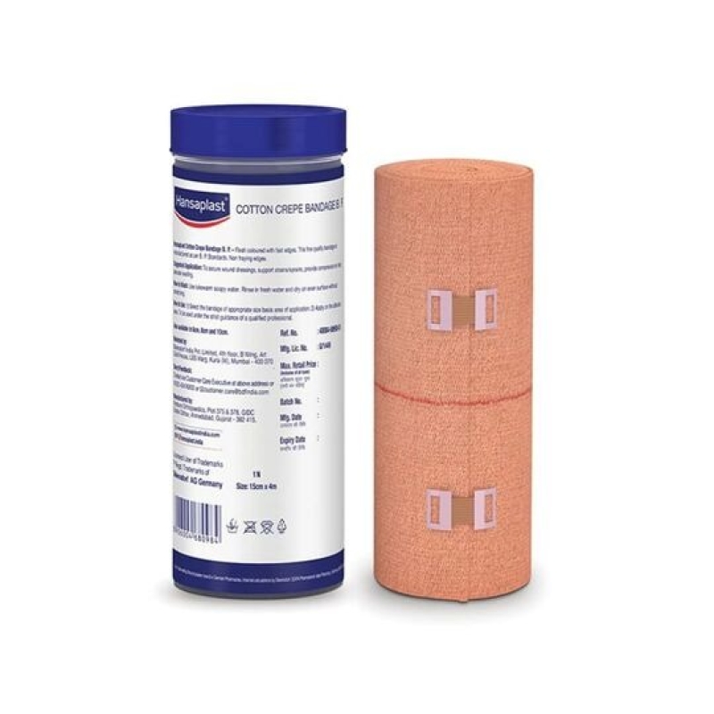 The Hansaplast Cotton Crepe Bandage (15 cm x 4 m) provides firm support, compression, and warmth to help relieve muscle strain and joint pain. Made from soft, skin-friendly cotton with sealed edges to prevent fraying, it blends discreetly with the skin and is ideal for multipurpose medical use. Durable and washable, it comes in four size options and is manufactured by Beiersdorf India.