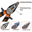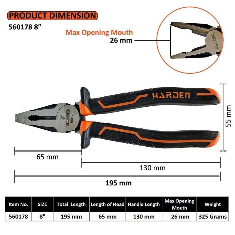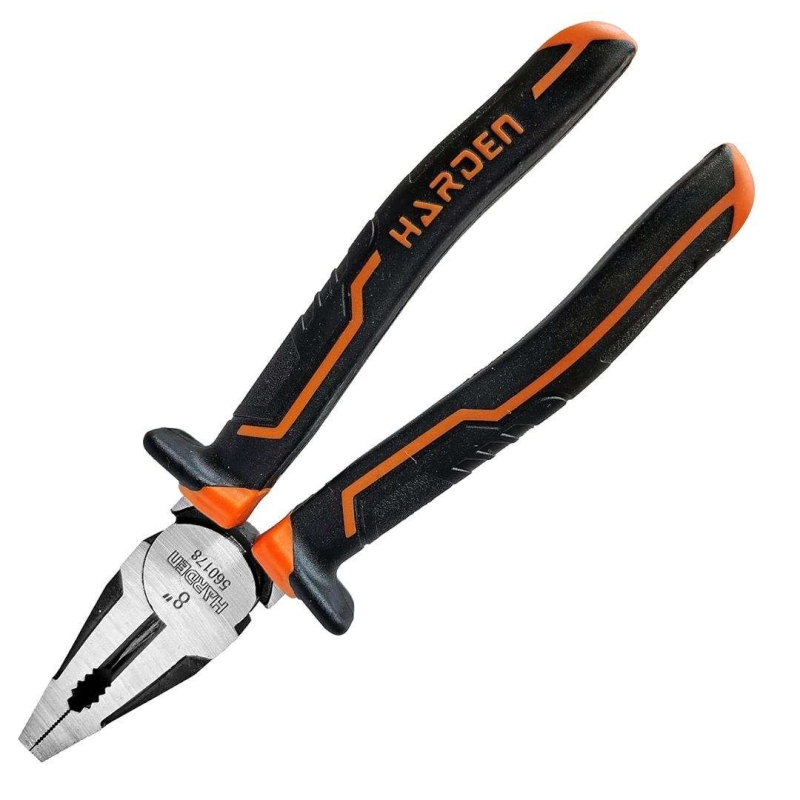 The Harden 8-inch Combination Plier is a durable, multi-purpose hand tool made from fine quality carbon steel for long-lasting performance. Featuring an ergonomic, anti-slip dual-color handle, it is ideal for clamping, cutting, holding, winding, and handling steel or iron wires with ease.