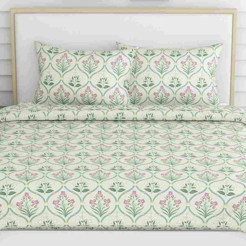 Experience soft comfort and elegant style with the Haus & Kinder Green Blossom Queen Size Bedsheet Set. Crafted from breathable 186 TC cotton, this bedsheet offers a smooth texture, long-lasting durability, and vibrant floral prints that instantly enhance your bedroom décor. Designed to fit both double and queen size beds, it includes two matching pillow covers for a coordinated, premium look. Fade-resistant and easy to maintain, this bedsheet set promises lasting freshness and everyday comfort.