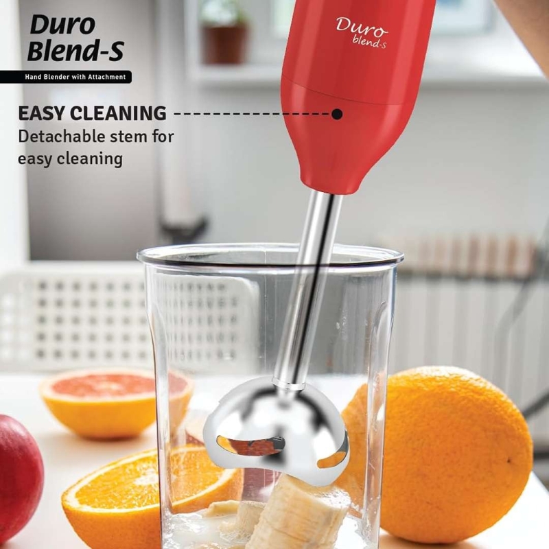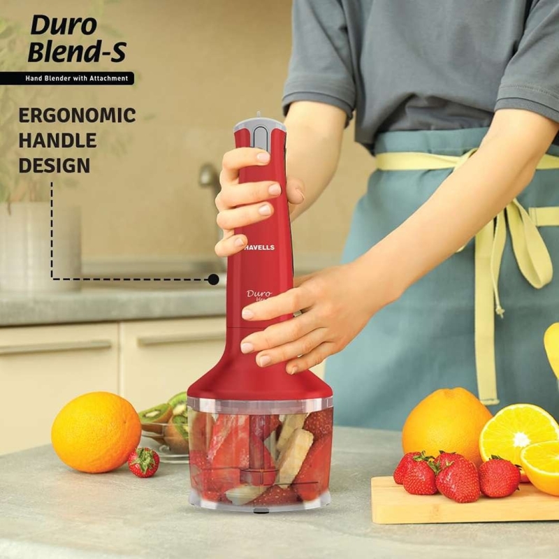 The Havells Duro Blend S is a lightweight and ergonomically designed hand blender with a powerful yet quiet 300W copper DC motor. It comes with a chopper attachment, detachable stem, and super-sharp stainless steel blades, making it ideal for blending, mixing, and chopping tasks. With two-speed settings, this hand blender offers flexibility for different food textures. Its compact form factor, robust build, and 2-year warranty make it a dependable kitchen essential for everyday use.