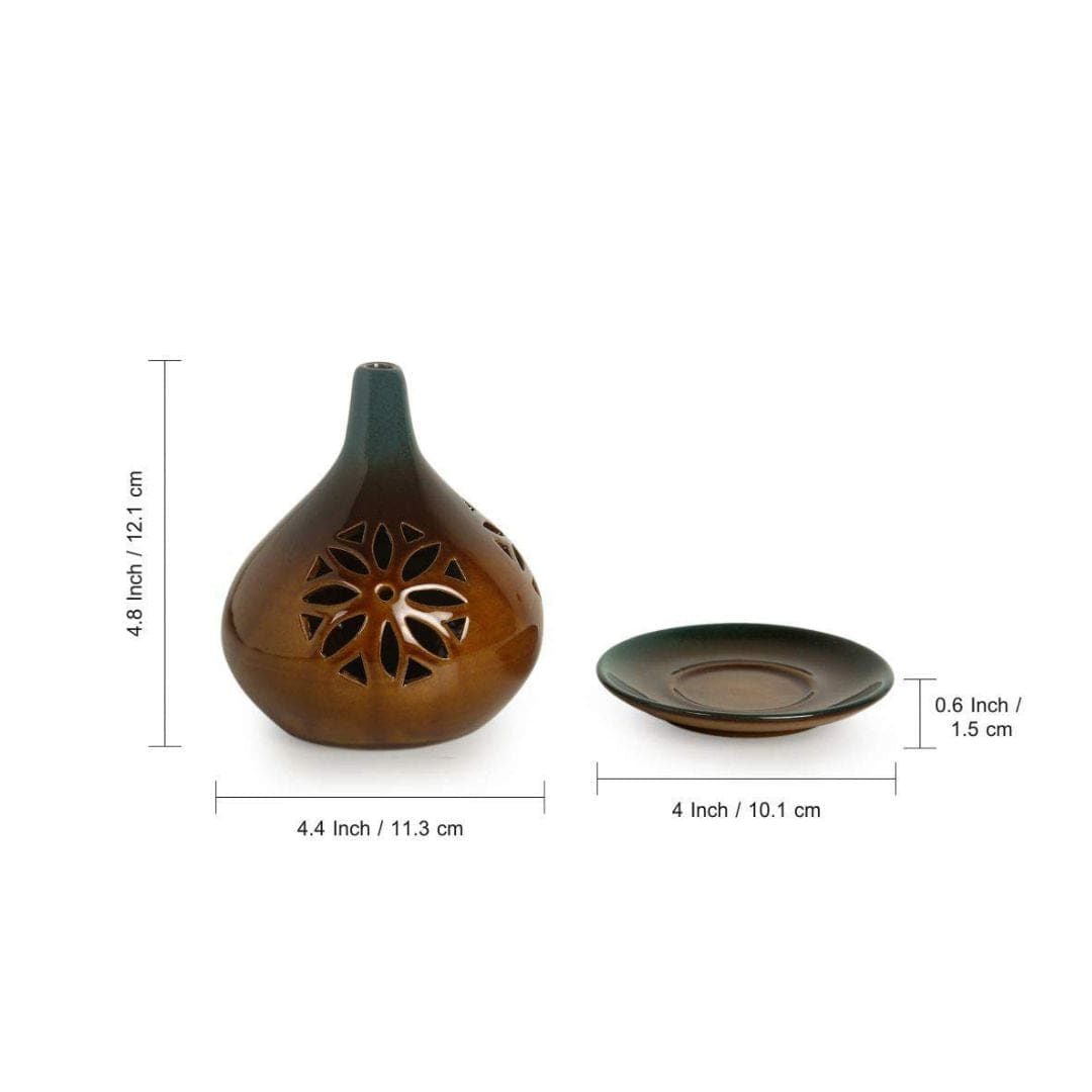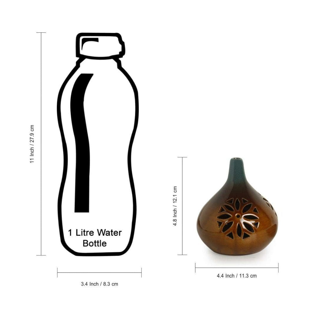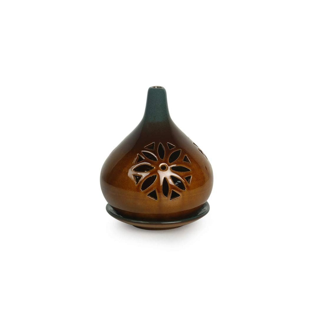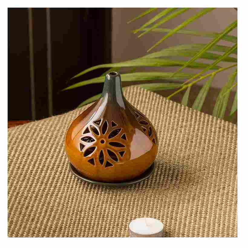 This ExclusiveLane ceramic table tea-light holder, featuring a beautiful amber with teal tints, is perfect for illuminating your living room or bedroom and creating a calming atmosphere. It has a detachable onion dome, and the polished finish gives it an elegant look. Please note that the tea-light is not included, and slight variations in glazing may occur due to the handcrafted process.