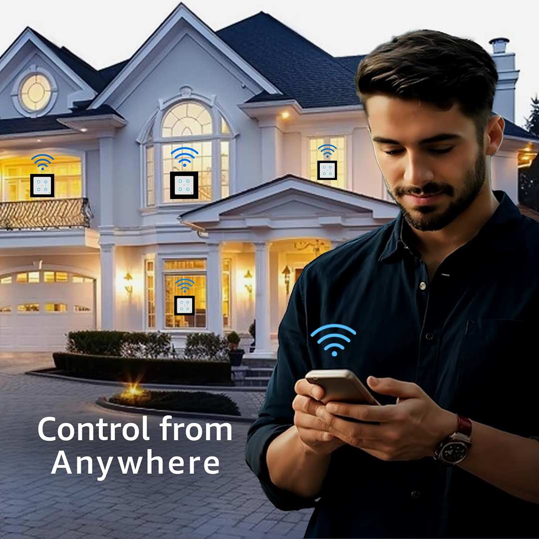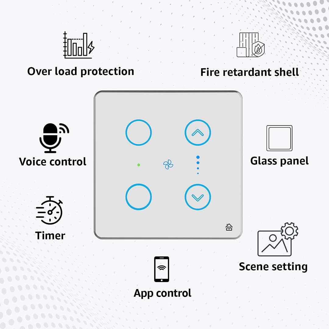 The HomeMate HM2T1FW Smart Touch Switch Board is a sleek, glass-finish smart switch that supports app and voice control via Alexa, Google Assistant, and Siri. With a 10A rating and 240V operation, it features timer and scheduling functions, customizable LED button colors, scene control, and smart scene automation. It is wall-mounted, IP65 rated, and perfect for modern smart homes.