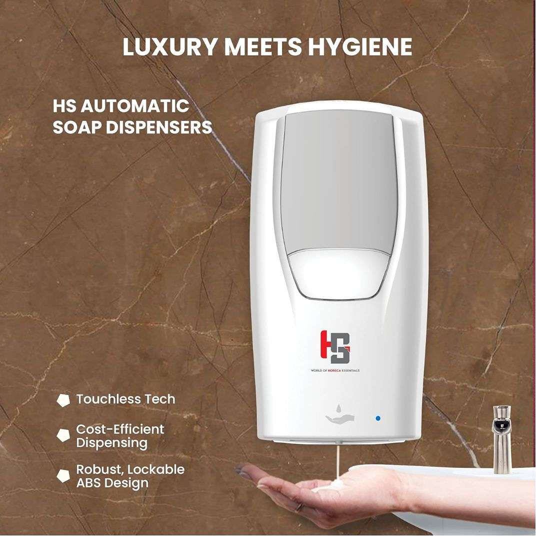 The HS WORLD OF HORECA ESSENTIALS Automatic Soap Dispenser features a sleek grey-white rectangular design crafted from durable ABS plastic. With an adjustable sensing range of 20–120mm, it's ideal for commercial settings. Easy to maintain and compatible with various liquid products like soap and sanitizer, this dispenser combines style with functionality for modern hygiene solutions.