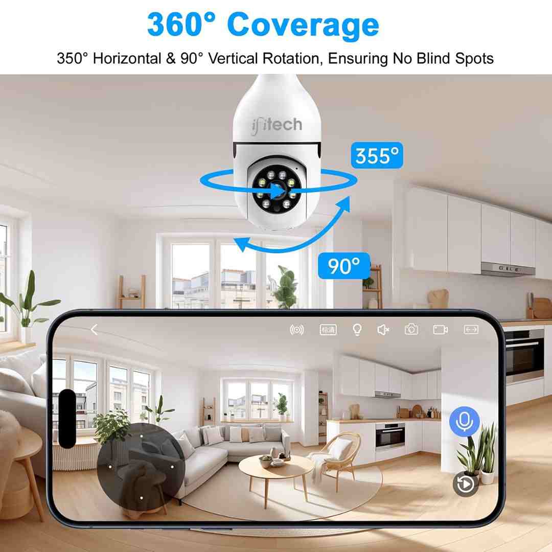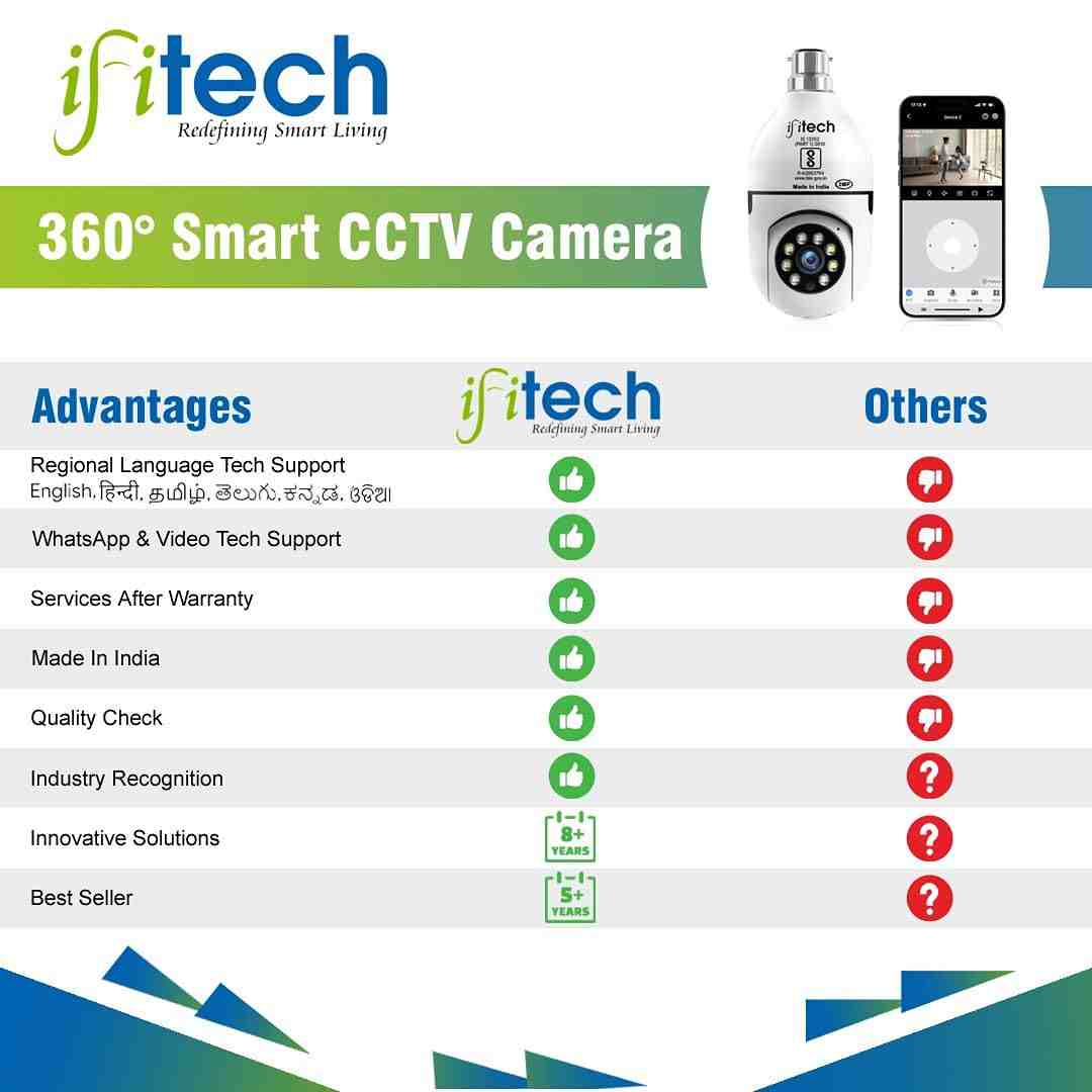 The IFITech 2MP Bulb Camera is an easy-to-install indoor surveillance device designed for home, office, and shop monitoring. With 1080p Full HD video, 360° PTZ coverage, color night vision, and app-based remote access, it offers reliable round-the-clock security. It fits into a standard B22 bulb holder, connects via 2.4GHz WiFi, and supports local SD card recording without the need for complex setups or wiring. no installation