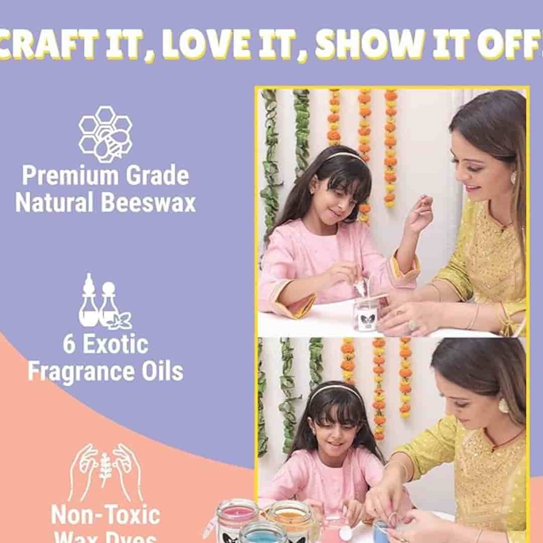 | Included Components | 500 gm Natural Beeswax, 6 Glass Jars, 6 Candle Wicks, 6 Wick Sustainers, 6 Fragrance Oils (5 ml each – lavender, strawberry, cocoa, lemongrass, green apple, candy), 6 Powder Colors, 6 Stirrers, Jute Thread, Jar Stickers and Tags, Instruction Manual |