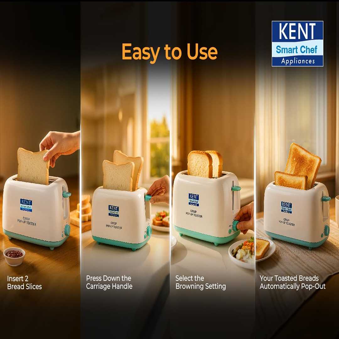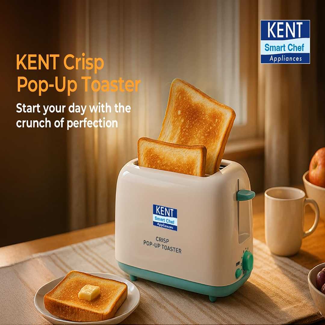 The KENT Crisp Pop Up Toaster is a sleek, modern 2-slice toaster designed for quick and even browning of bread. It features a convenient cancel function, 6 browning settings, and a compact design ideal for any kitchen countertop. With 750 Watts of power, it ensures efficient toasting every time.