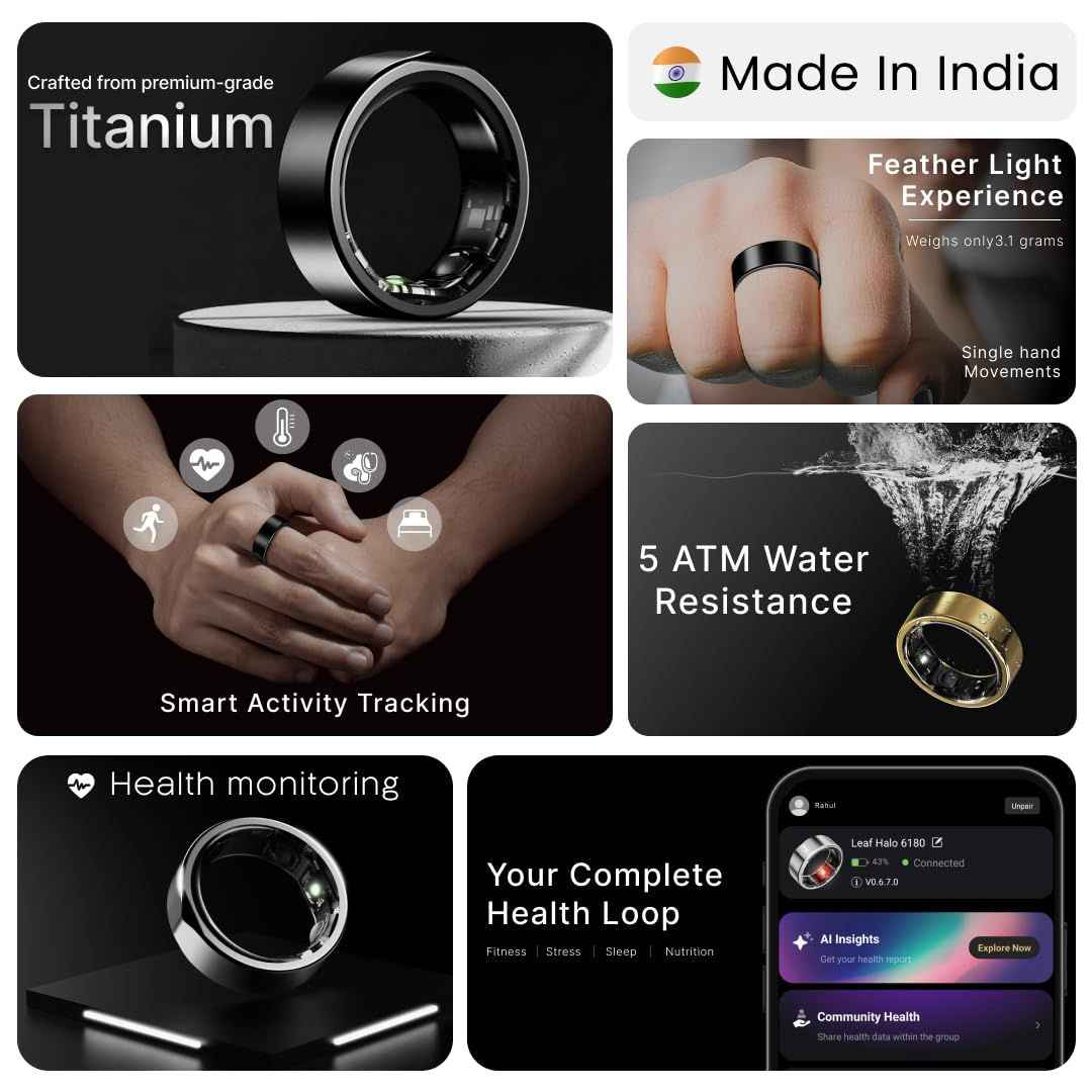 The Leaf Halo Smart Ring (Luxe Gold edition) is a powerful, minimalist health and fitness wearable that tracks critical wellness metrics such as heart rate, HRV, VO₂ Max, and SpO₂ — all from your finger. With detailed sleep tracking, real-time stress monitoring, and workout analysis, it delivers a 360° view of your physical and mental wellness. Lightweight at just 3g and crafted from high-strength titanium, the Leaf Halo Ring combines style with performance. Its wireless charging case and waterproof build make it ideal for 24/7 use.