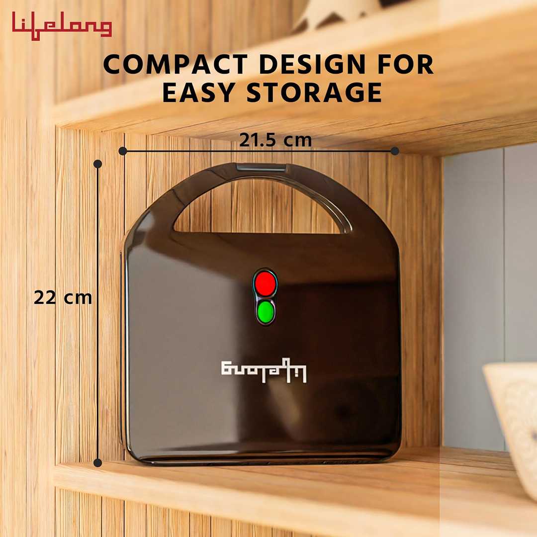 The Lifelong LLSM120G Sandwich Maker in elegant black features non-stick plates for low-fat, healthy sandwiches. Its cool-touch outer body ensures safety, while the hinged lock guarantees perfectly grilled sandwiches. Compact, lightweight, and easy to use, it comes with a 1-year warranty.