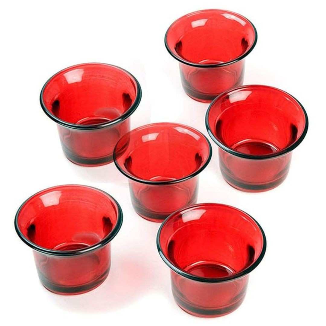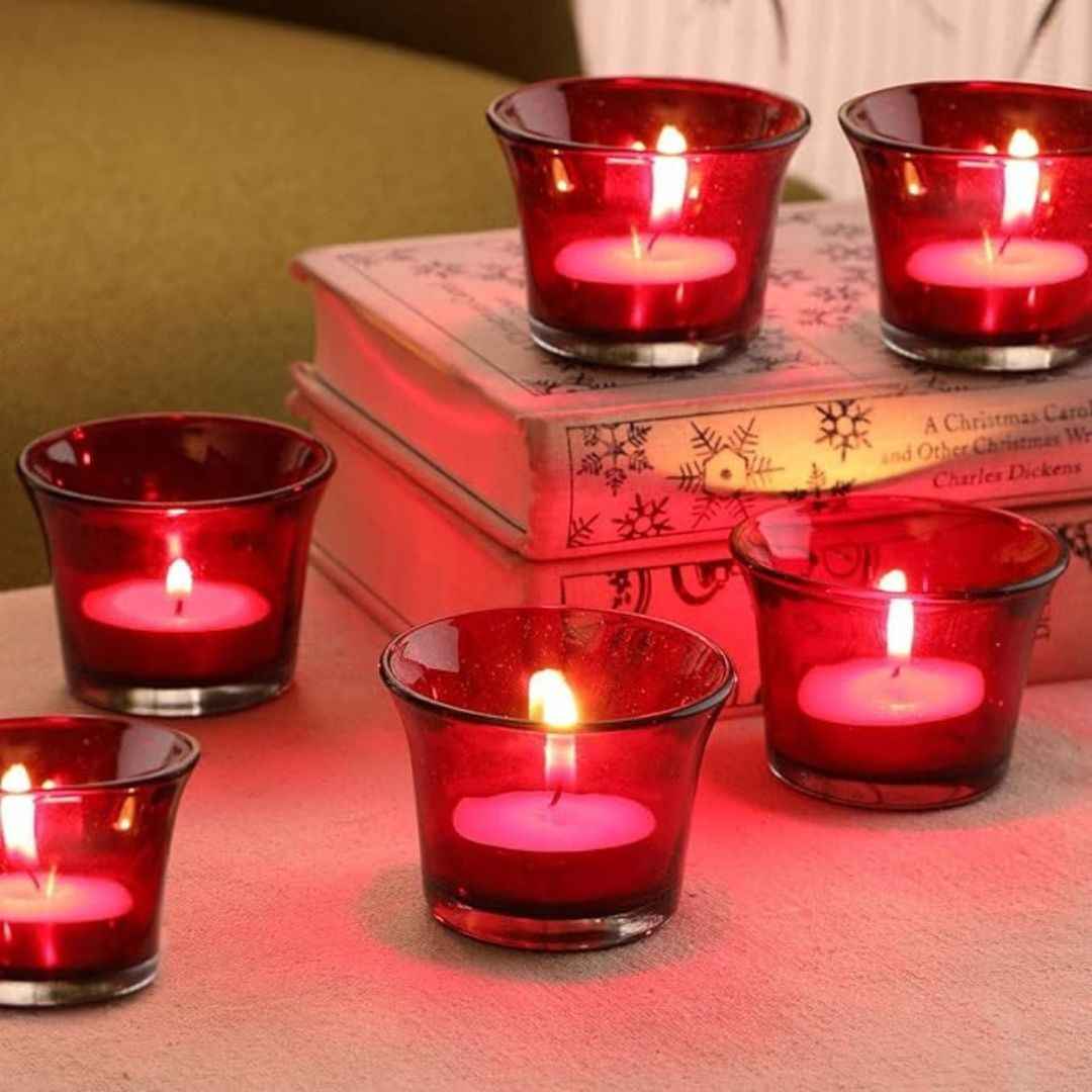 Add a touch of elegance to your festive or romantic setup with this set of 6 glossy red glass votive tealight candle holders by TIED RIBBONS. Perfect for anniversaries, parties, or home décor, these compact and stylish holders create a warm, inviting glow when paired with tealight candles.