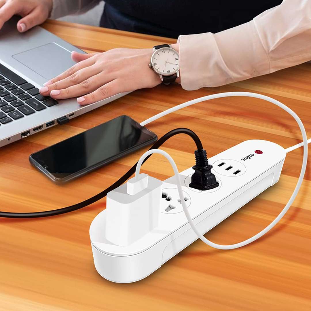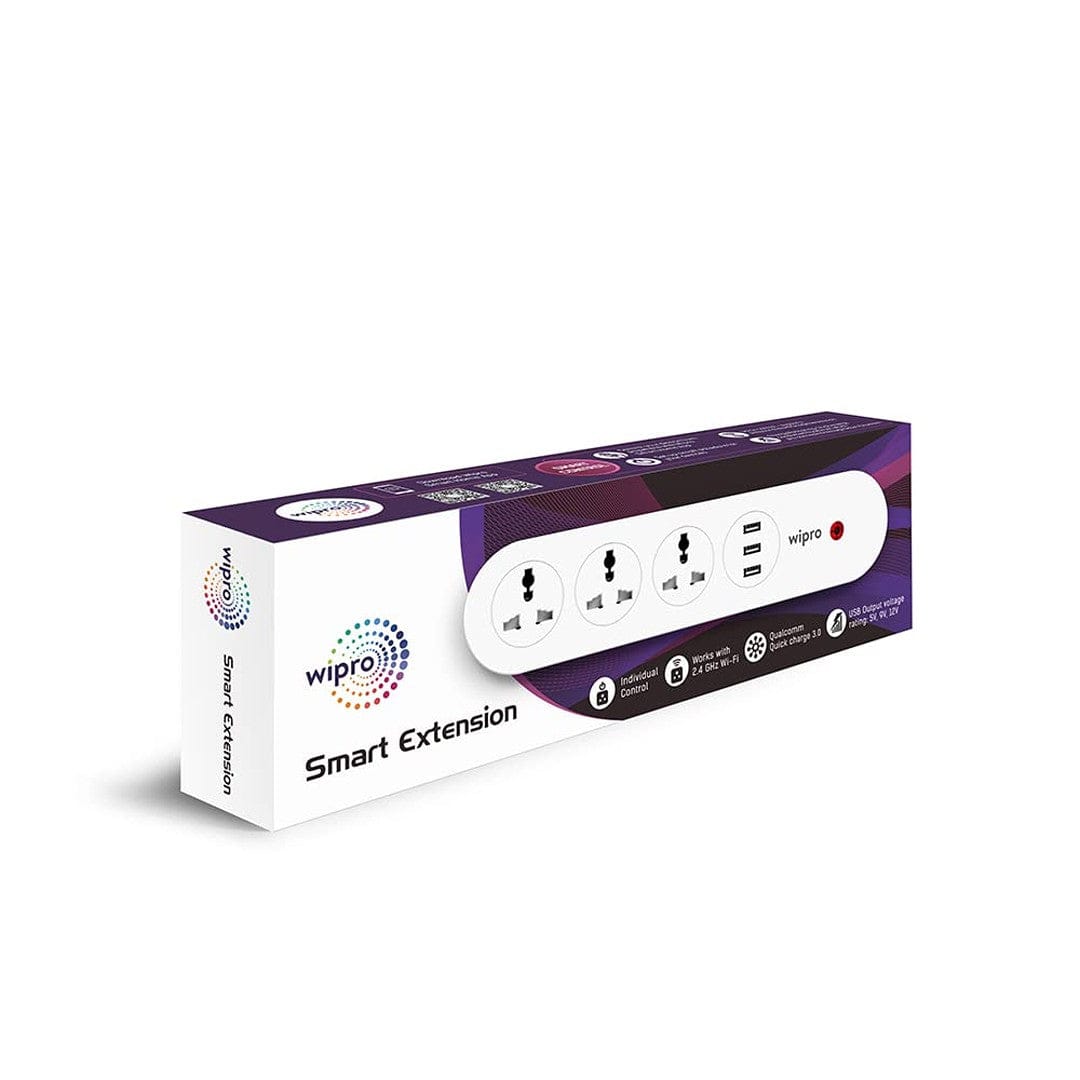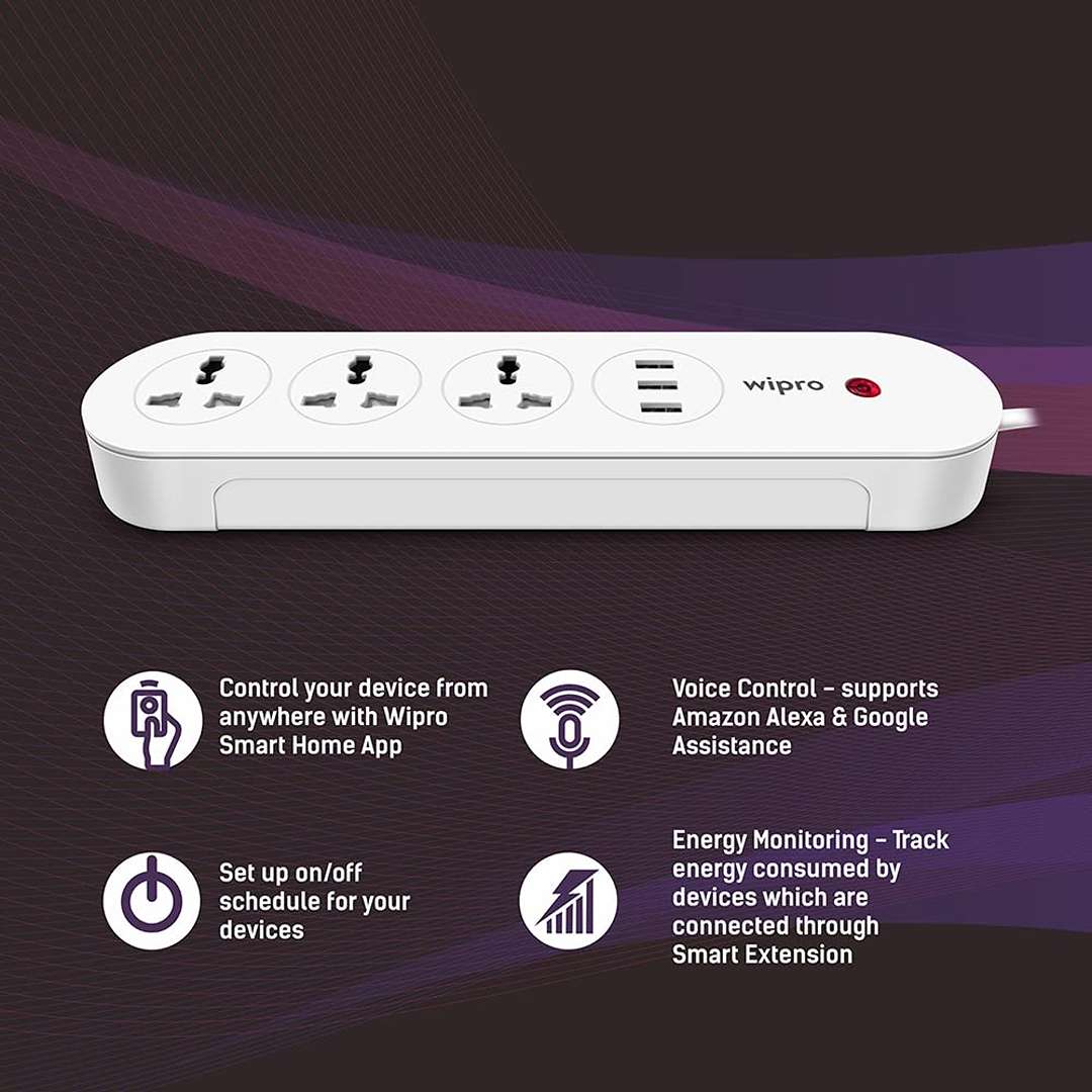 wipro Smart Wi-Fi Usb Extension Board With 3 Universal Socket & 3 Usb|Voice Control With Alexa&Google Asst|Energy Monitoring Feature For Connected Device|Schedule On/Off (Pack Of 1,White),12 Volts