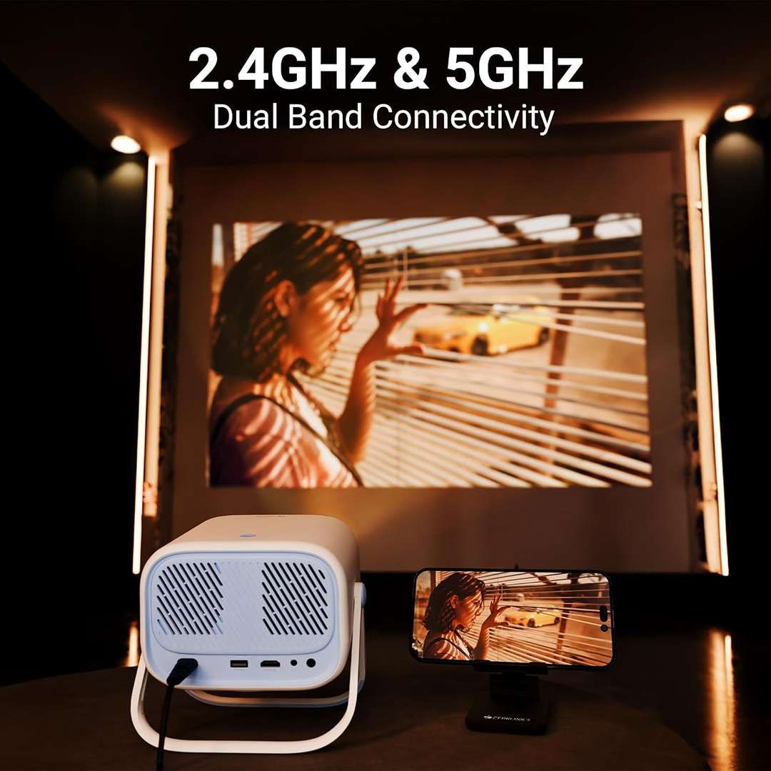 The ZEBRONICS ZEB-Pixaplay 34 is a full HD LED projector that brings your home entertainment to life with a massive screen size of up to 508 cm. It features advanced sensor technologies like auto-focus, auto-keystone, and obstacle detection for hassle-free setup. With 5200 lumens brightness, dual-band Wi-Fi, Bluetooth 5.1, and a quad-core processor, it ensures seamless streaming and vivid visuals. This compact, lightweight projector is compatible with laptops, smartphones, gaming consoles, and more, making it ideal for home cinema, gaming, or presentations.