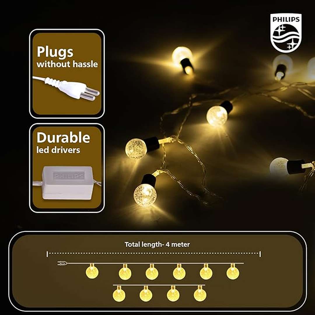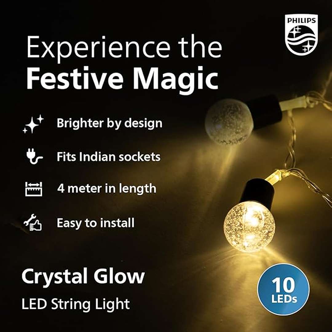 Philips 4M Decorative LED String Light features 10 warm white LEDs encased in crystal-like covers, creating a sparkling and elegant glow. Energy-efficient and easy to install, it’s perfect for accent lighting on balconies, walls, pooja rooms, or small decorative spaces.