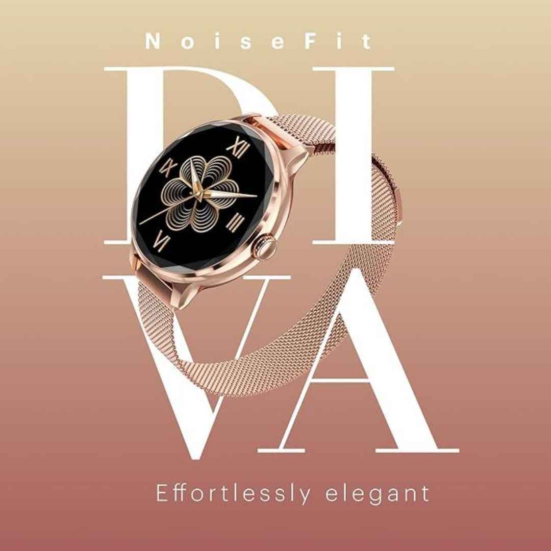 The NoiseFit Diva (Glossy Metallic Rose Gold) is an elegant and compact smartwatch featuring a 1.1-inch display, 4-day battery life, and Bluetooth connectivity. Its lightweight, rose gold design offers essential health tracking and smart features ideal for everyday use with a touch of style.