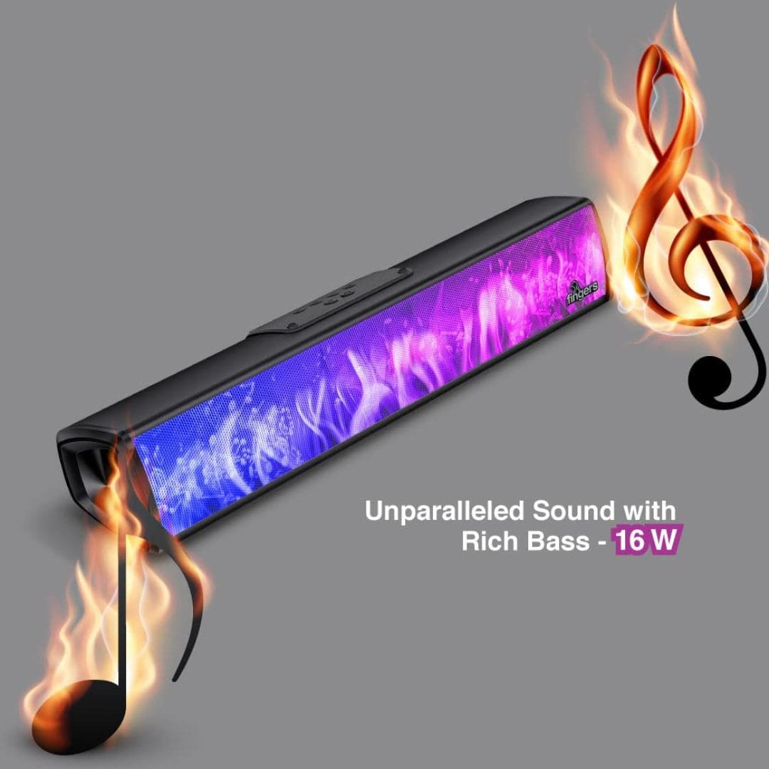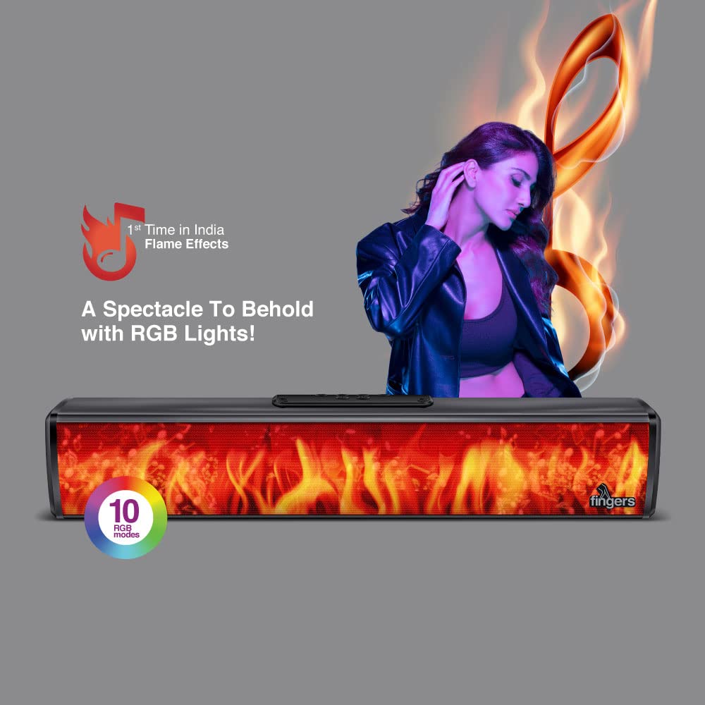 Experience India’s first portable speaker with mesmerizing flame effects that sync with your music! The FINGERS SoundFlame delivers rich, deep bass with 16 Watts of power and features 10 RGB lighting modes to create an immersive audio-visual atmosphere. Enjoy up to 4 hours of playback with multiple connectivity options including Bluetooth 5.3, USB, MicroSD, and AUX. Fast charge with USB Type-C and control it all effortlessly with the included magnetic remote. Perfect for music lovers seeking style and powerful sound on the go.