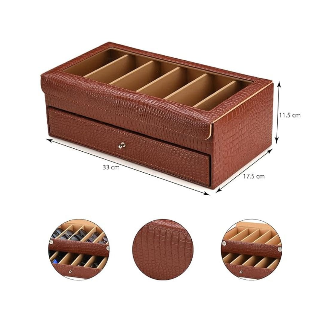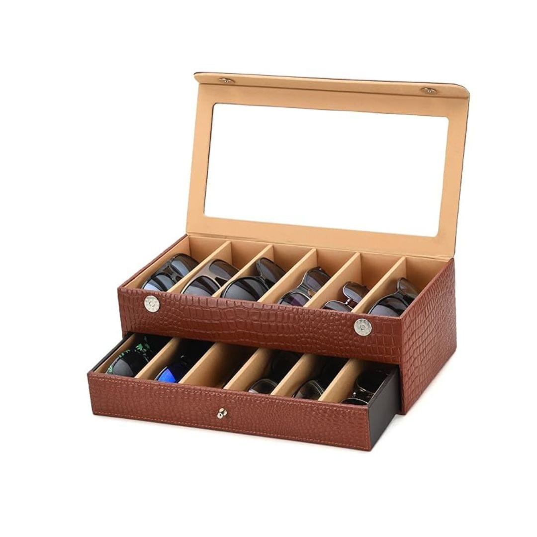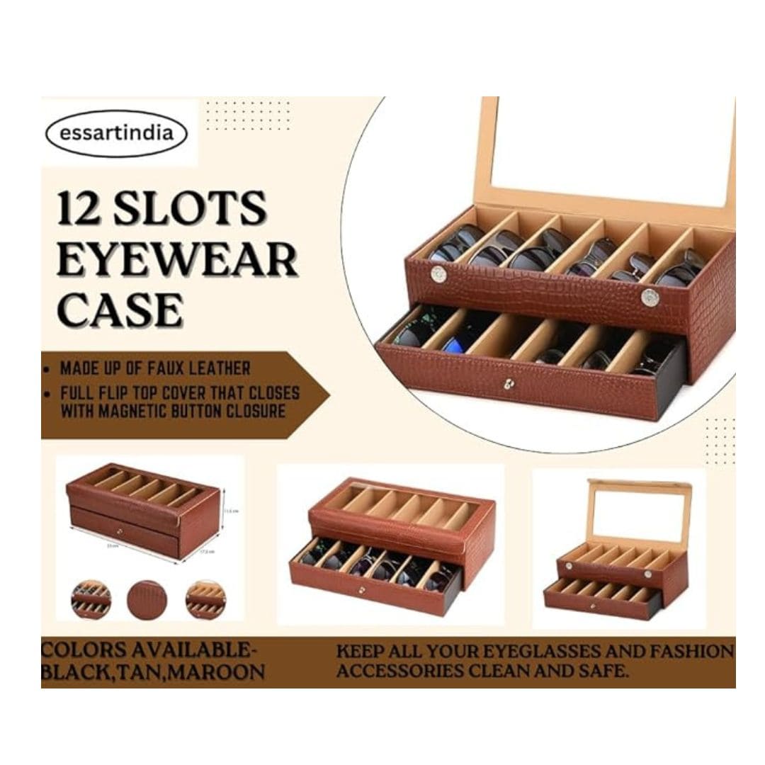 The Essart India Sunglasses Storage Case is a premium, high-capacity organizer designed to store up to 18 pairs of sunglasses. Crafted from PU leather with a soft fabric-lined interior, it offers protection against scratches and damage. The magnetic flip-top cover ensures easy access while keeping eyewear securely in place. Ideal for personal or retail use, this sturdy and stylish case is made in India and is perfect for keeping your collection clean, safe, and organized.