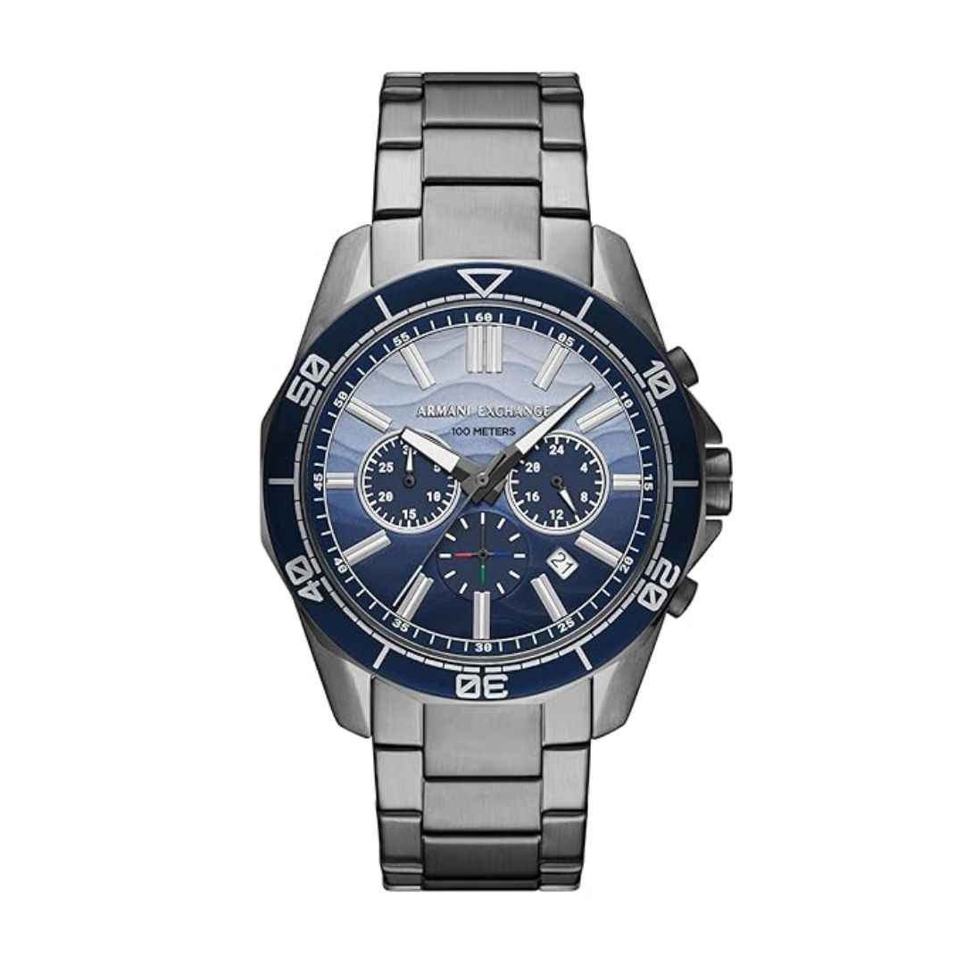 The Armani Exchange AX1967 is a bold and modern chronograph watch crafted with a 44mm stainless steel case and a stylish gray metal bracelet. Featuring a quartz movement with a chronograph analog display and water resistance up to 100 meters, this watch is ideal for both everyday use and adventurous outings. The blue dial adds a sharp contrast, making it a standout timepiece for today’s man.