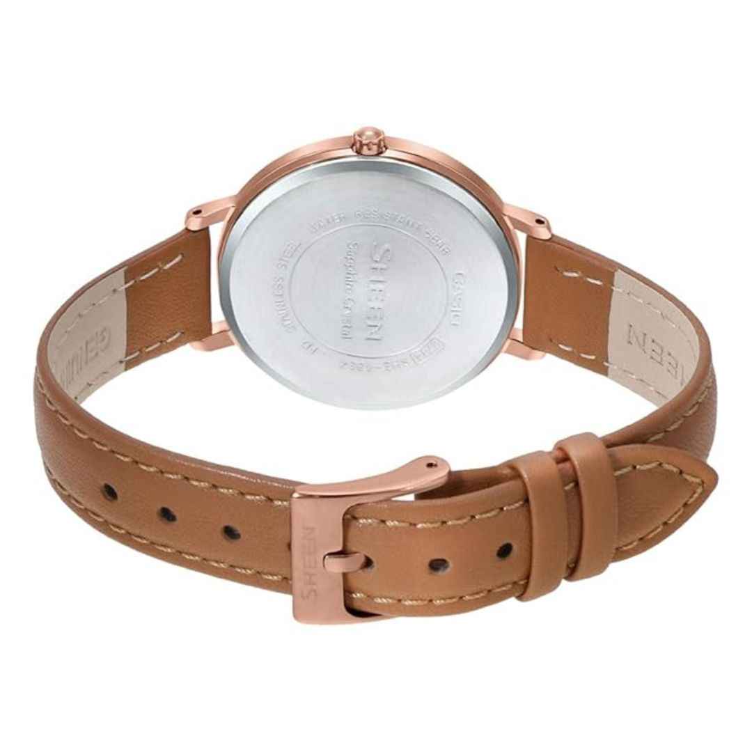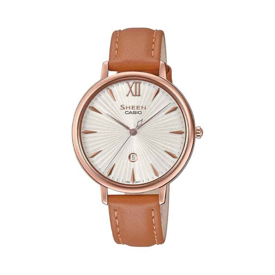 The Casio SHE-4534PGL-7AUDF (SH223) from the Sheen series is a premium analog watch designed for women who appreciate timeless elegance. Featuring a classic white dial, brown leather strap, and sapphire crystal glass, it combines sophistication with durability. With 50 meters water resistance, a stainless steel case, and precise Quartz movement, it’s an ideal choice for daily wear or formal occasions.