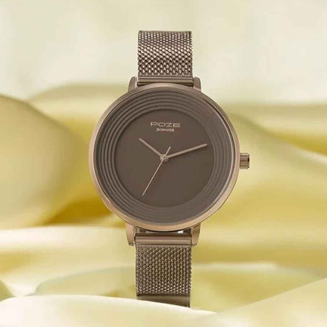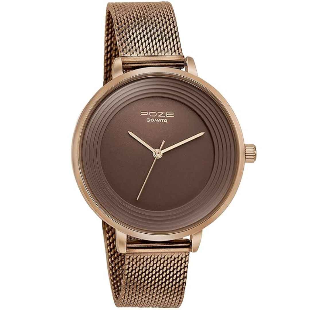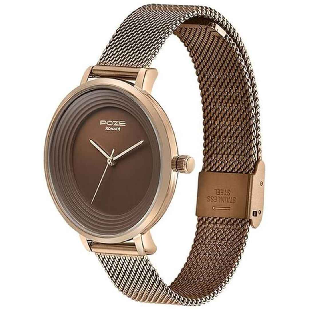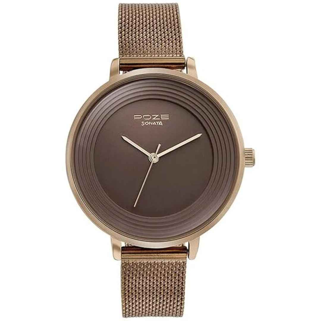 The Sonata Poze Quartz Analog Watch is a stylish timepiece for women featuring a brown dial and matching brown metal mesh strap. With a sleek round alloy steel case and reliable quartz movement, it combines elegant design with daily functionality. This watch is ideal for casual or semi-formal wear and is backed by a limited warranty from Titan.