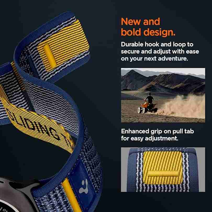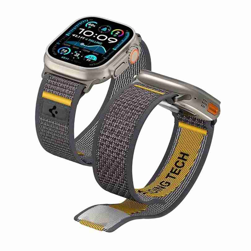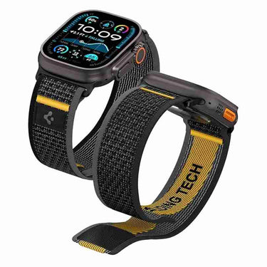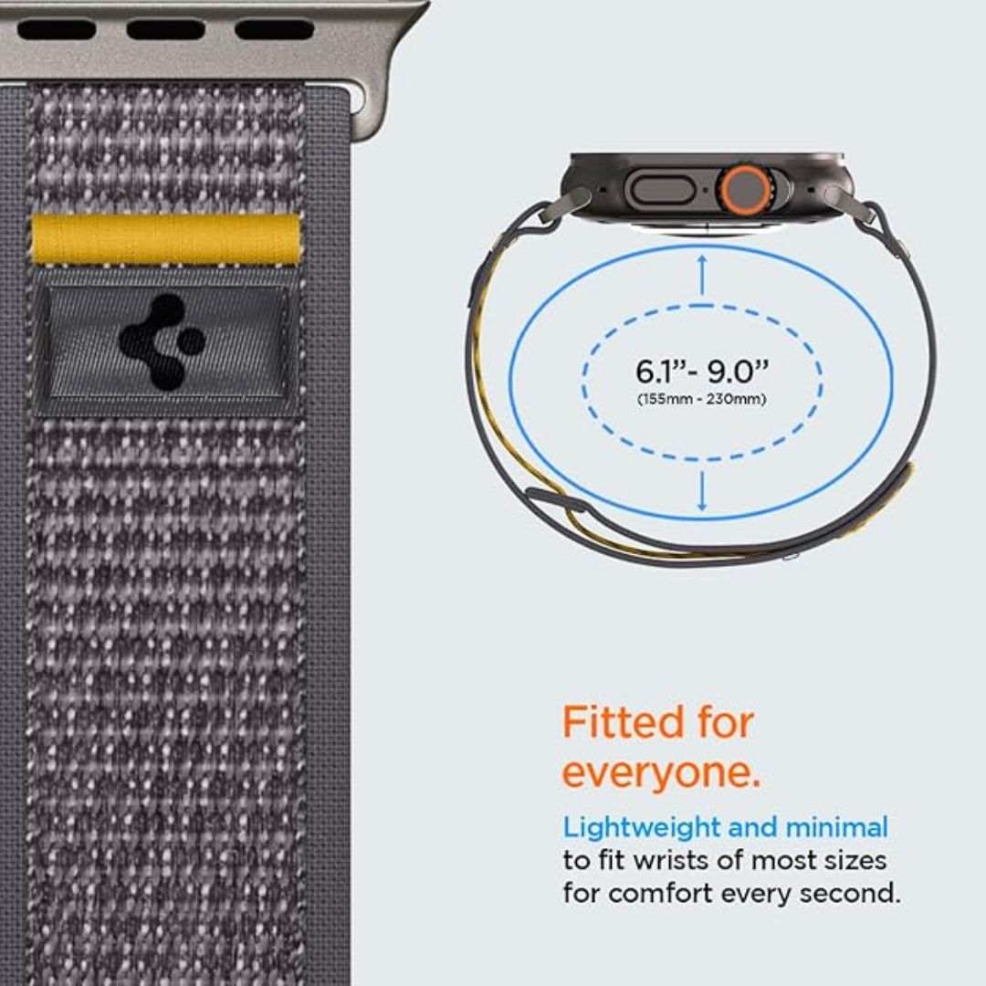 Spigen Athlex Air is a lightweight, breathable, and sporty watch band designed for Apple Watch Ultra 3/2/1 (49mm), Series 11/10 (46mm), 9/8/7 (45mm), SE2/SE/6/5/4 (44mm), and 3/2/1 (42mm). Made from premium nylon with a reliable hook-and-loop closure, it offers a secure, slip-free fit for wrists 6.1"–9.0" (155–230mm). Perfect for workouts or everyday wear, its signature yellow stitching adds a bold, athletic touch to your watch.