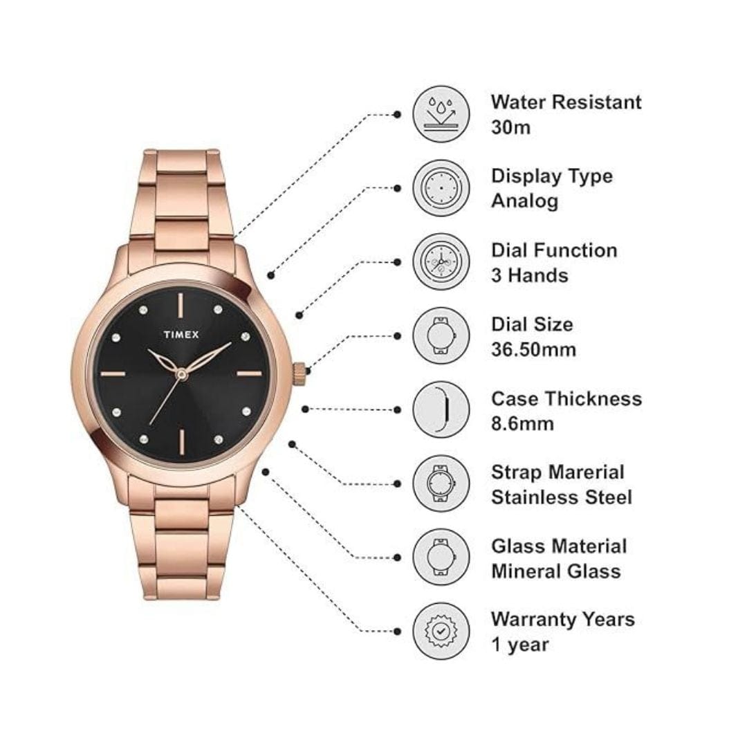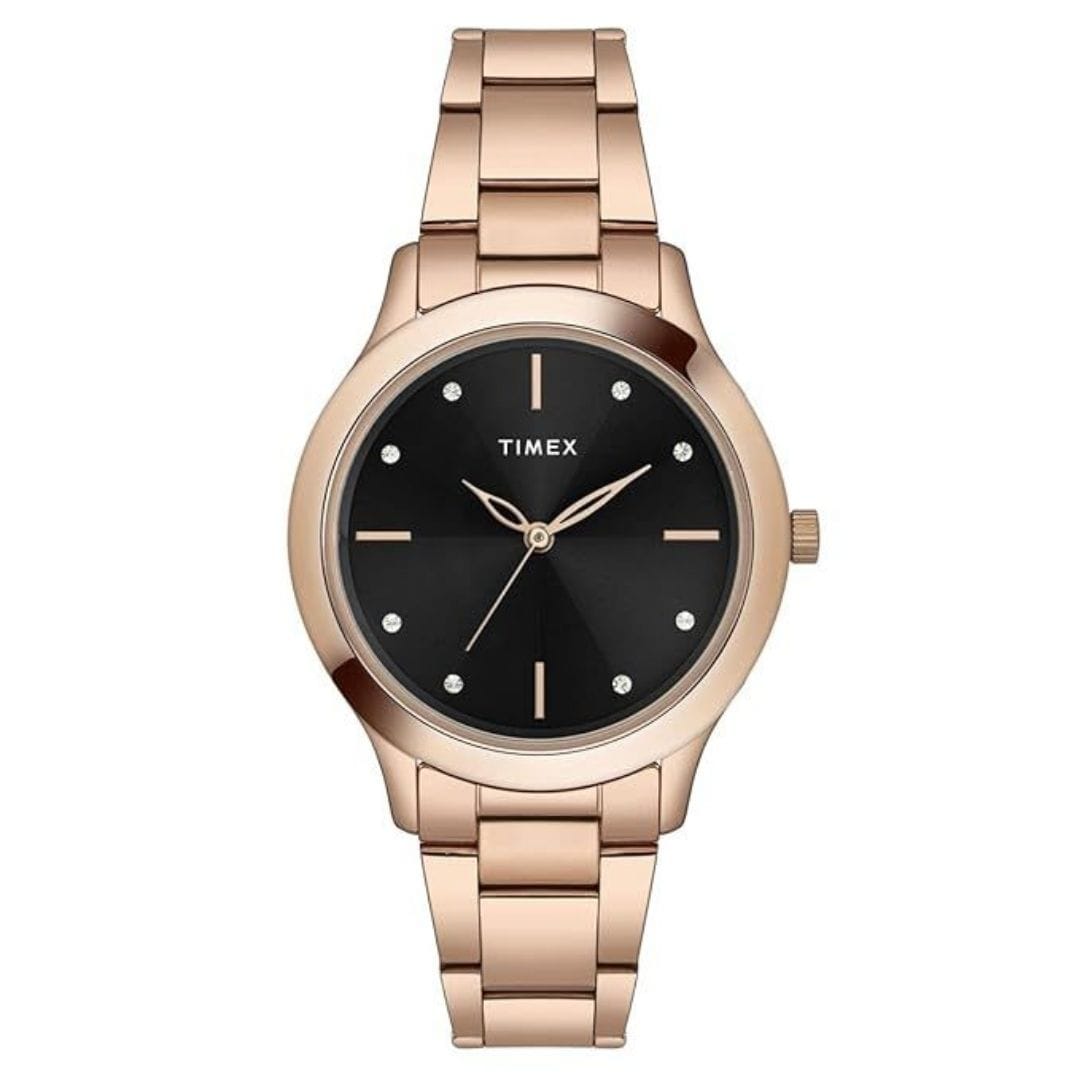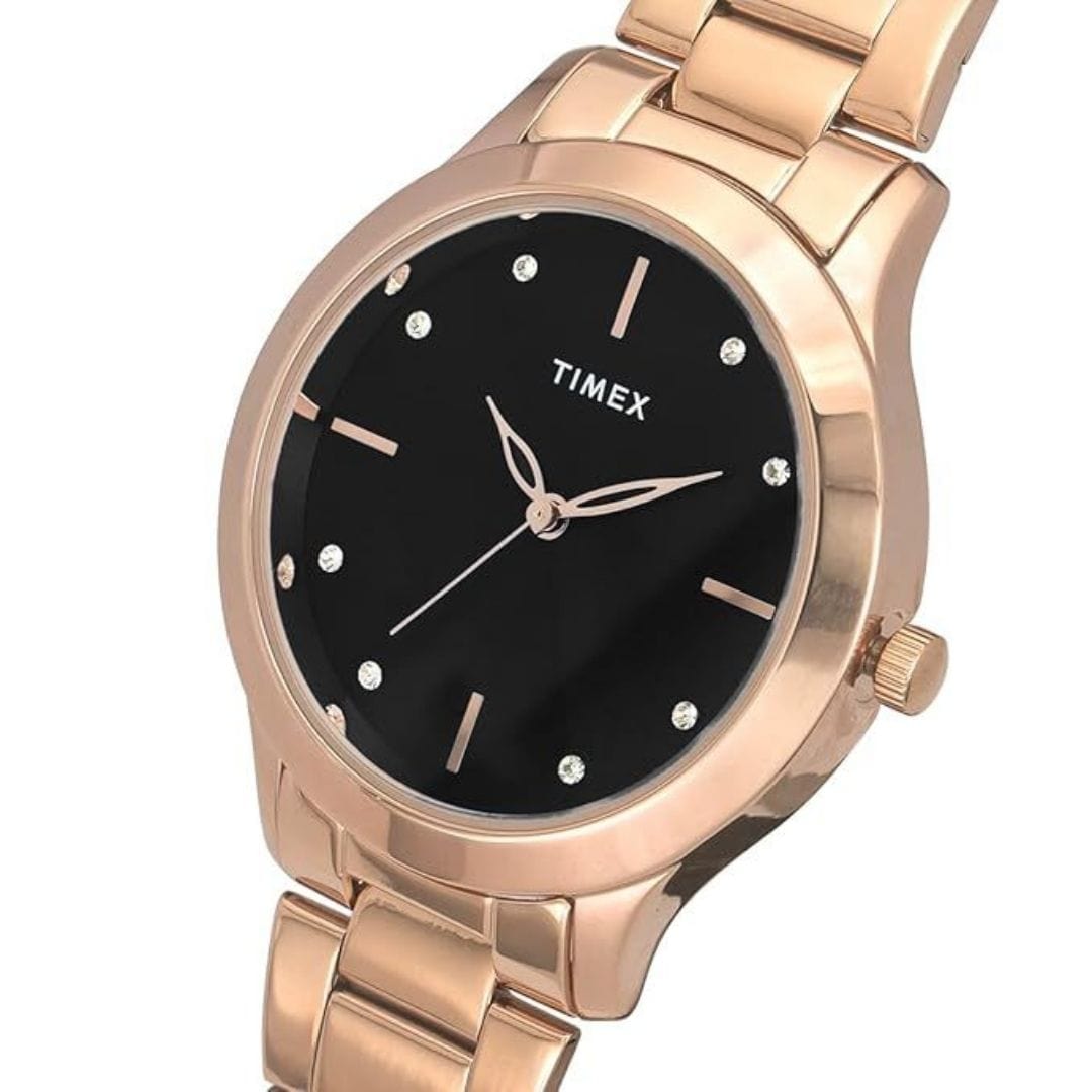 Stylish and reliable, the Timex TWEL98SMU06 analog watch features a black round dial with a rose gold stainless steel strap. Equipped with quartz movement, day display, and 30-meter water resistance, this watch offers a perfect blend of elegance and everyday functionality.