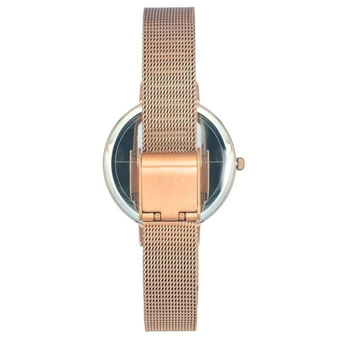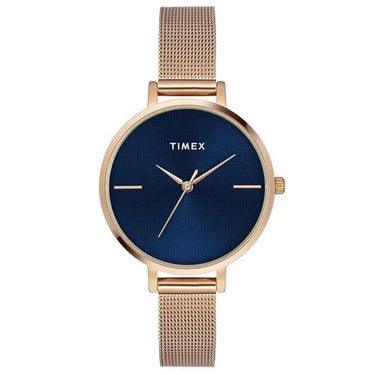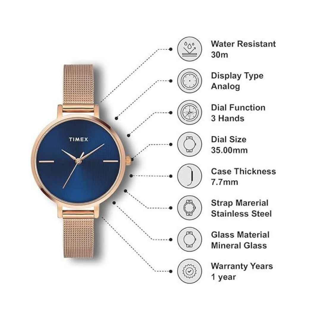 Elegant and modern, the Timex TWEL155SMU07 women’s analog watch features a striking blue dial and rose gold stainless steel strap. Designed with quartz movement, day display, and 30 meters water resistance, it's perfect for everyday wear and special occasions alike.