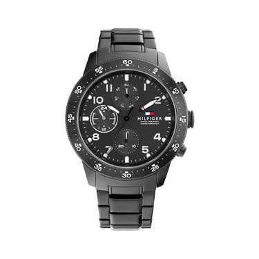 The Tommy Hilfiger NDTH1791951W is a stylish men's analog watch featuring a black dial, stainless steel black band, and secure clasp. With a 43mm round metal case, quartz movement, and water resistance up to 50 meters, this watch combines elegance and performance. Designed and manufactured by Titan Company Limited in India, it also includes a durable mineral glass crystal and open dial design.