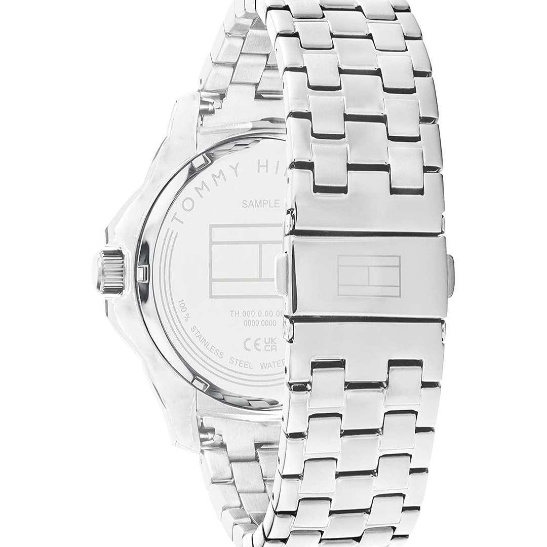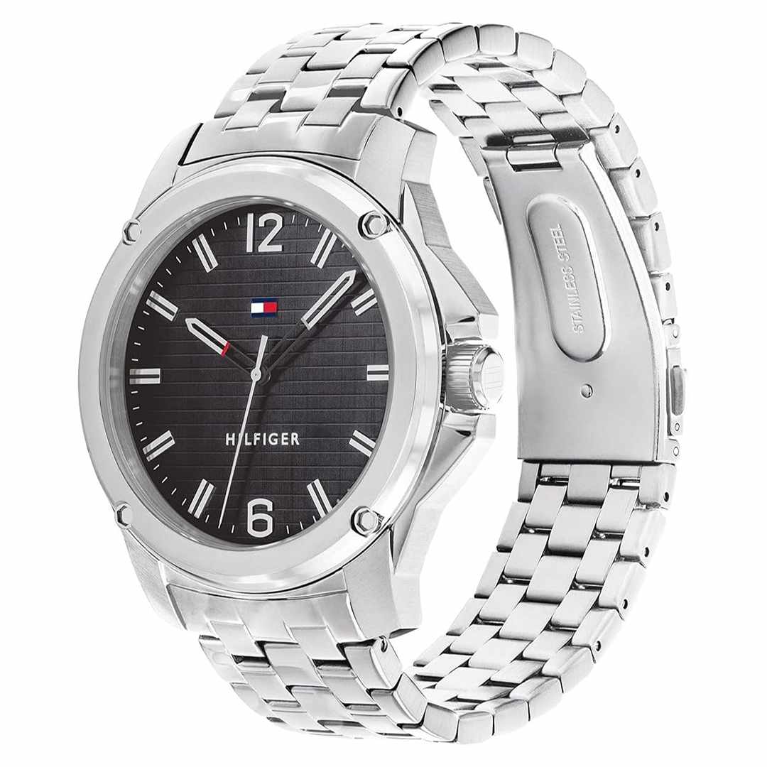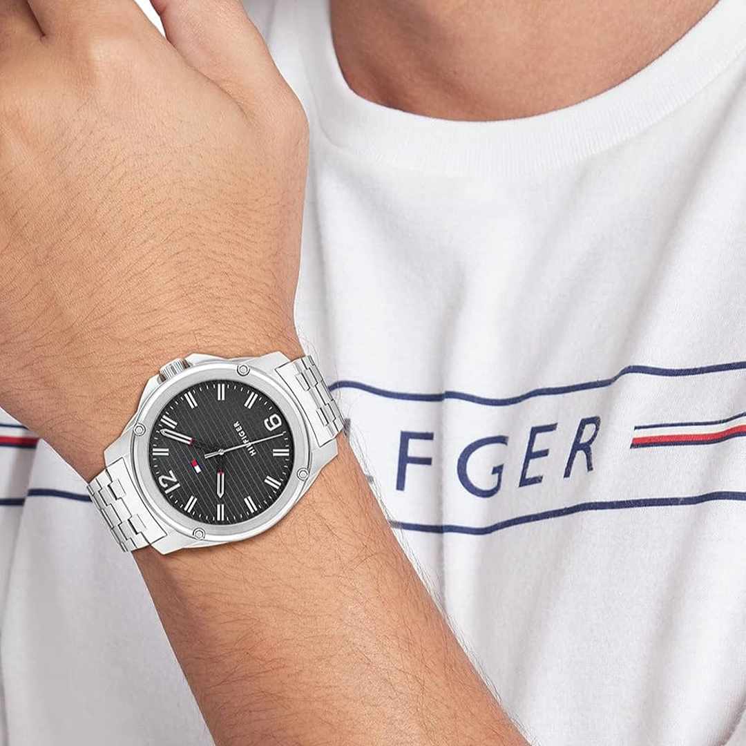 The Tommy Hilfiger TH1710486W is a stylish men's analog watch featuring a sleek grey dial, a durable stainless steel silver band, and a 43mm round metal case. With Quartz movement, 50-meter water resistance, and glow-in-the-dark hands, it's designed for everyday elegance and functionality. Manufactured by Titan Company Limited in India, this watch is both robust and fashionable.