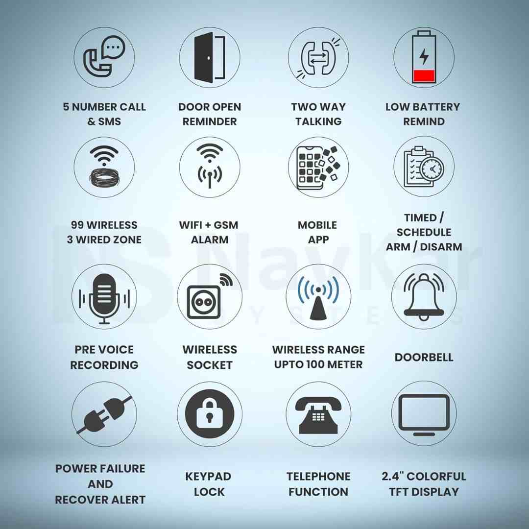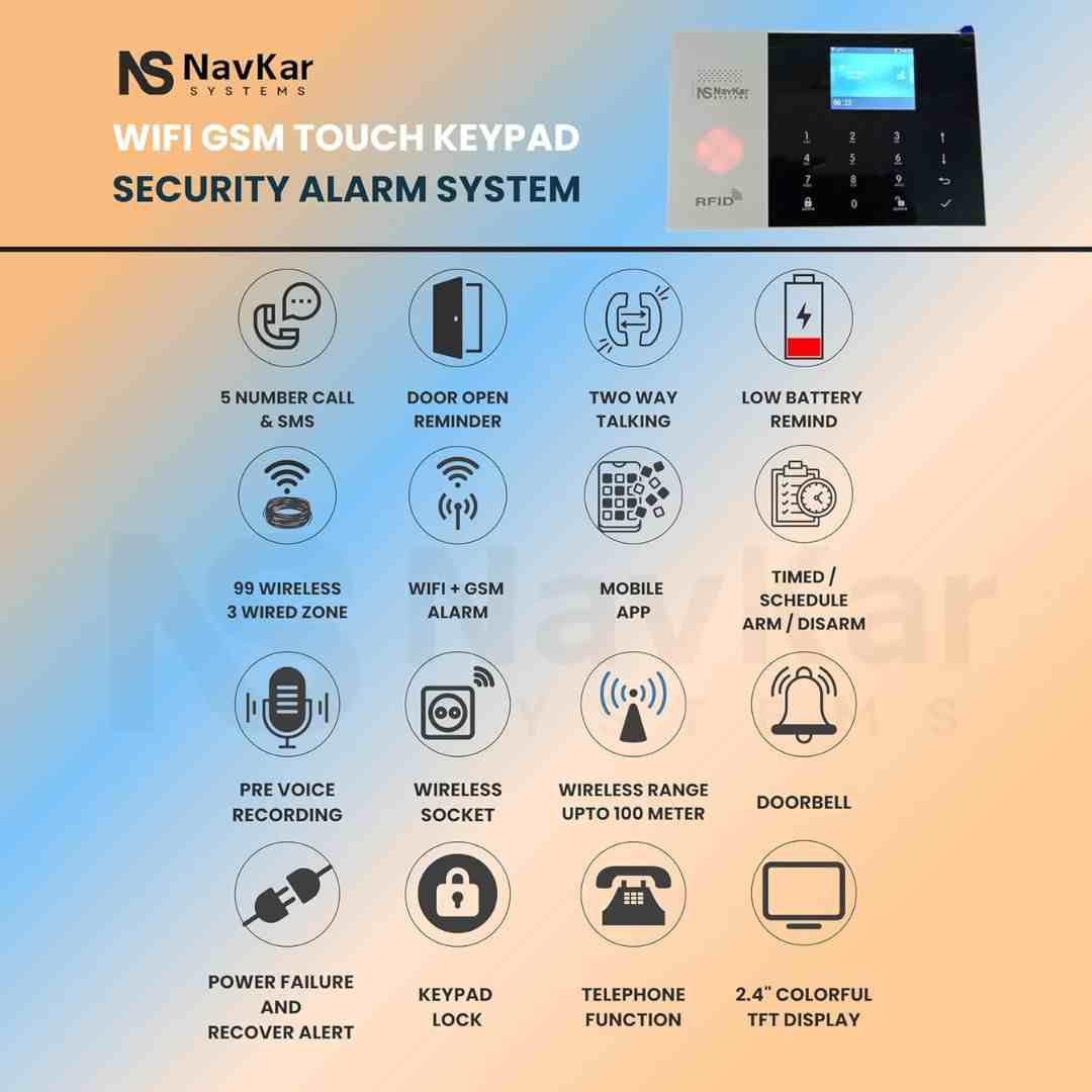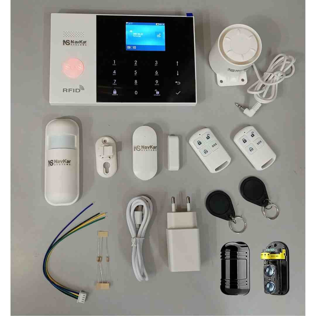 The Navkar Systems GSM + WiFi Smart Home Security Alarm Kit is a reliable and expandable DIY security system designed for homes, offices, and shops. It supports dual network connectivity (WiFi + GSM), instant alerts via SMS, app notifications, or calls, and multiple arming modes for flexible protection. With support for up to 100 sensors, long-range signal coverage, and backup battery, this kit ensures uninterrupted safety.