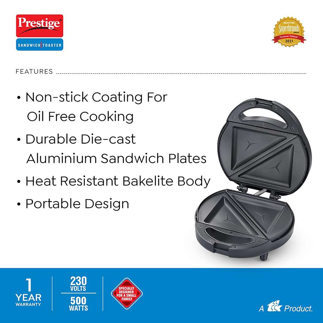 Prestige PSSP Single Sandwich Toaster with Fixed Sandwich Plate(500W, Black, Non-Stick)