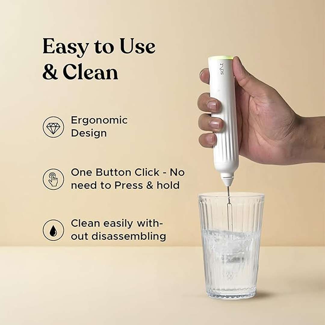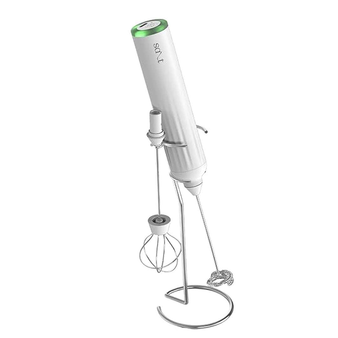The Salt 3-in-1 Rechargeable Milk Frother (White) features three interchangeable heads—frother whisk, egg beater, and mixer whisk—with three adjustable speed settings. Powered by a rechargeable battery and paired with a stainless steel stand, it offers a versatile, ergonomic, and durable solution for frothing, whisking, and mixing at home.