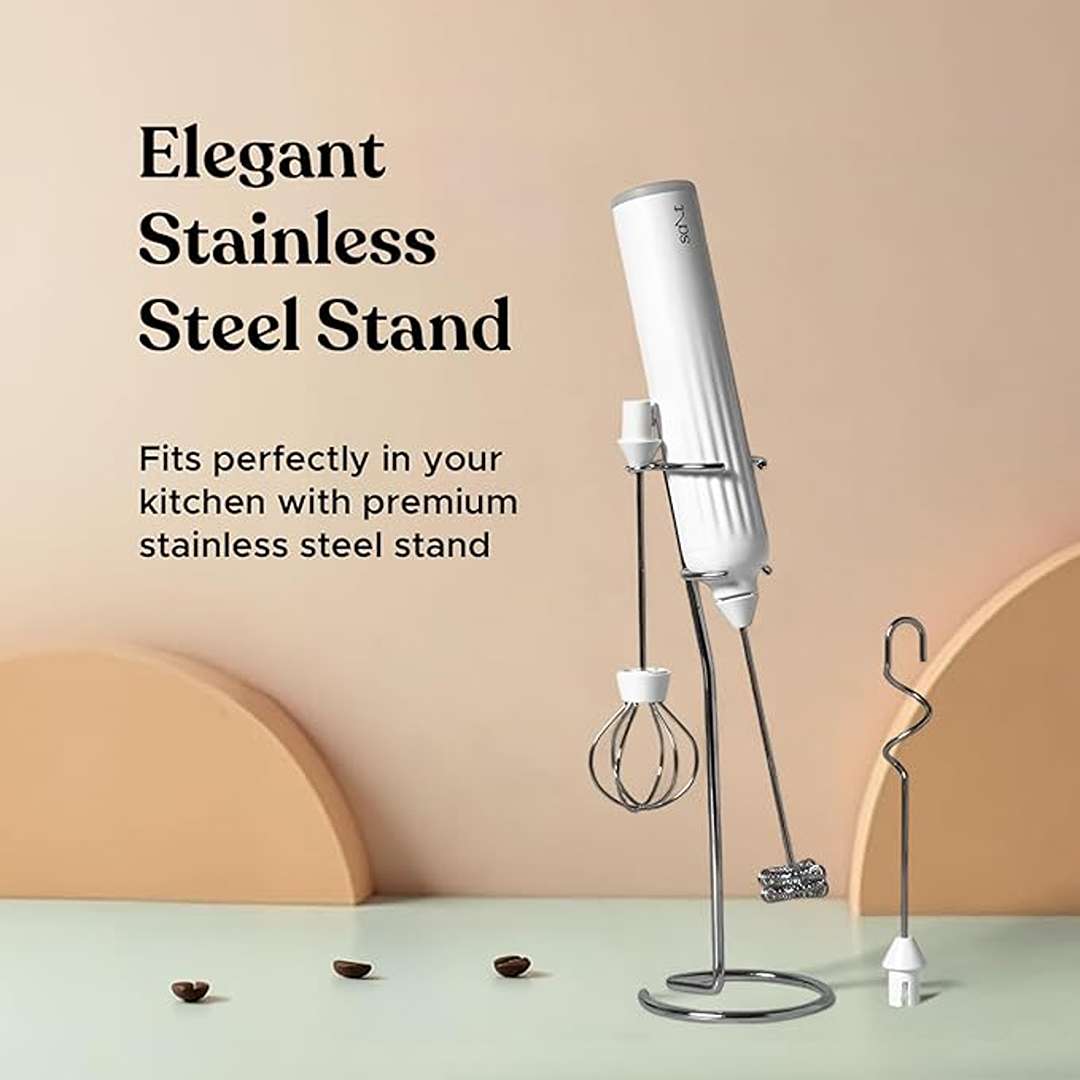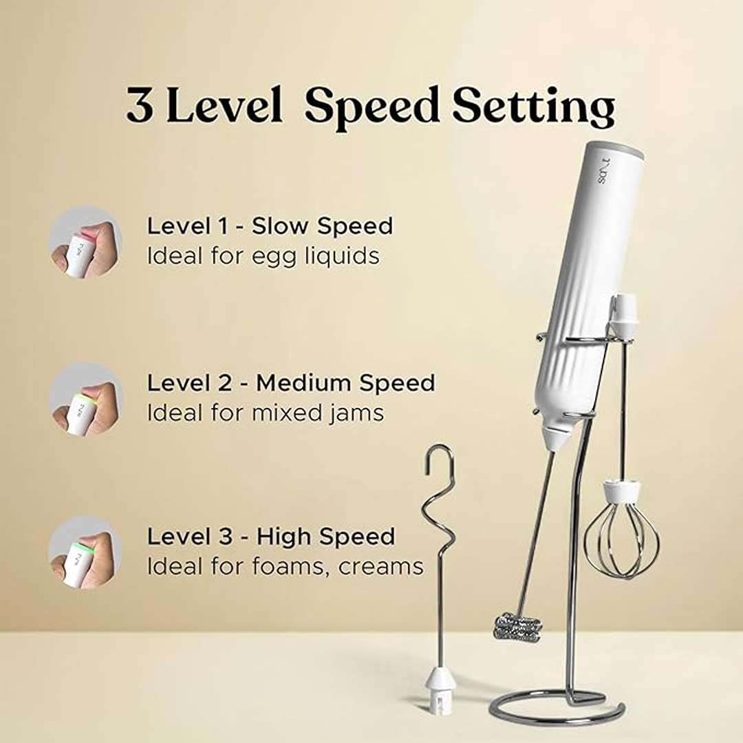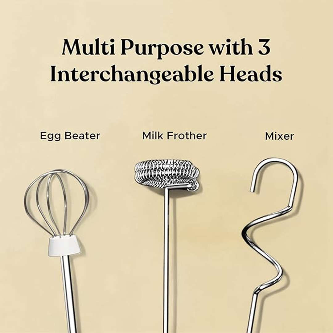 Special Features | 3 Interchangeable Heads (Frother Whisk, Egg Beater, Mixer Whisk), 3 Speed Settings, Premium Design, Rechargeable Battery, Stainless Steel Stand Included |