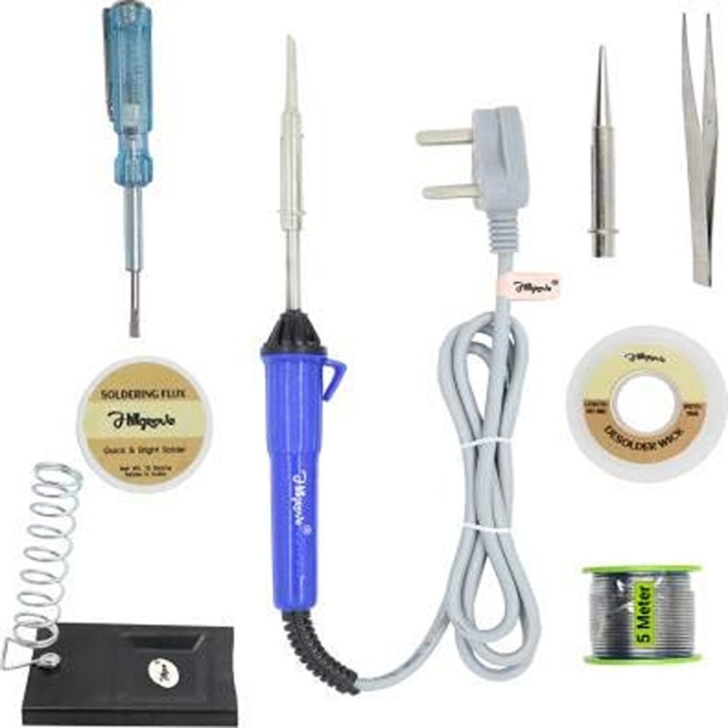 The Walkers WL-8IN1 soldering kit is a compact 25W corded electric toolset designed for professional indoor electronic repair tasks. It includes essential accessories such as a tweezer, soldering stand, soldering paste, solder wire, desoldering wick, pointed bit, and tester. Built with a Nichrome burner and weighing only 230 g, this 8-in-1 kit is ideal for precise, small-scale soldering work.