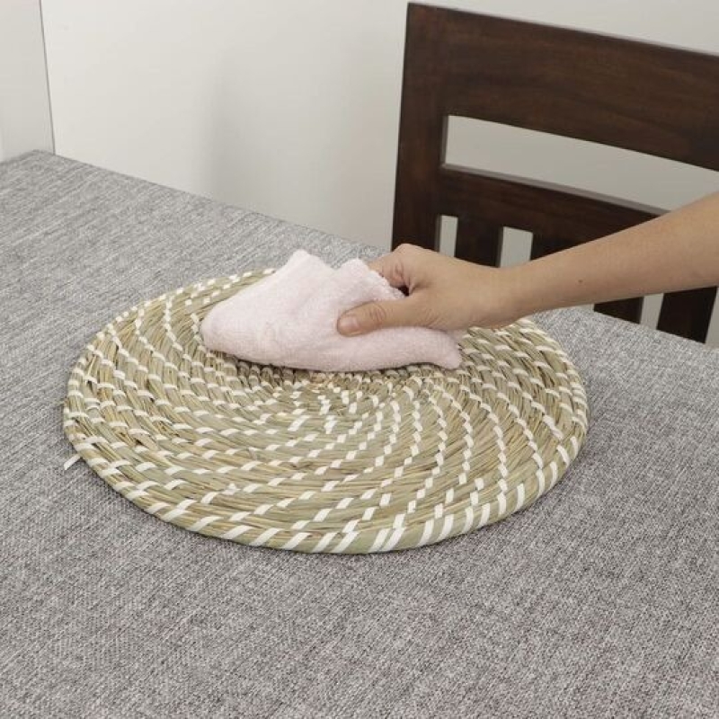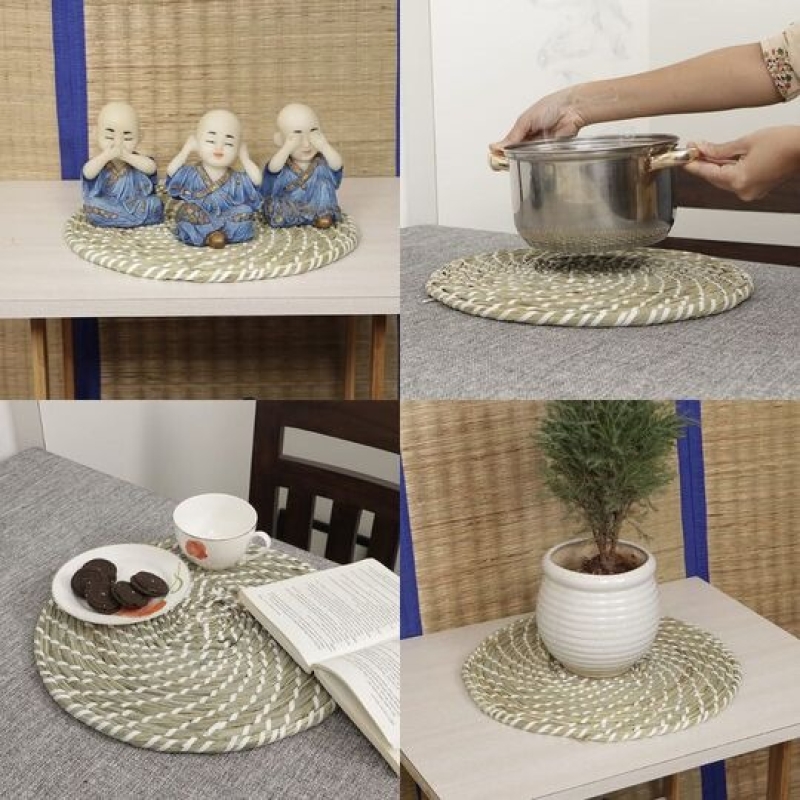 The HomeStorie Round Straw Placemat is a handcrafted, eco-friendly table accessory made from durable natural straw. Its beige color blends seamlessly with any décor, making it ideal for center tables, side tables, and as a hot pot stand. Thick, sturdy, and easy to maintain, this 14-inch mat only requires a simple wipe-clean to stay fresh and functional. Perfect for everyday home use.