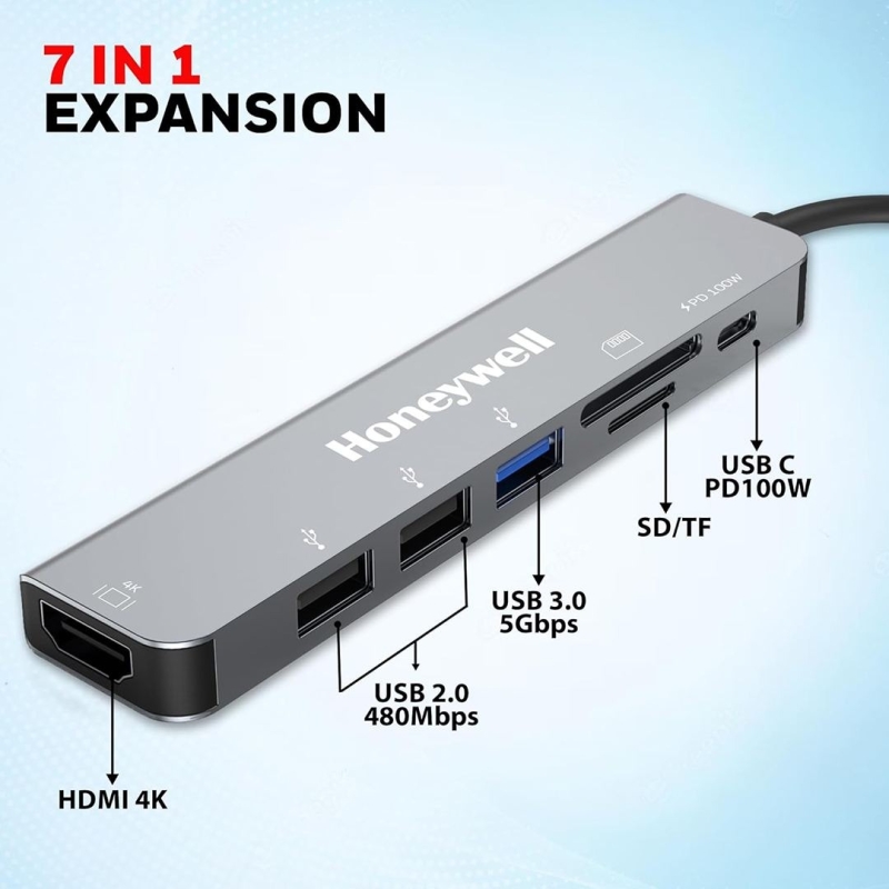The Honeywell 7-in-1 Type-C Docking Station is a sleek, compact, and powerful USB-C hub designed for MacBook Pro and other USB-C devices. With support for high-speed data transfer, 4K HDMI output, 100W PD charging, and SD/MicroSD card reading, it transforms a single USB-C port into a complete connectivity solution. Its plug-and-play functionality makes it ideal for both work and entertainment setups.