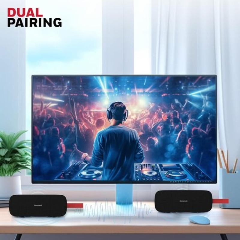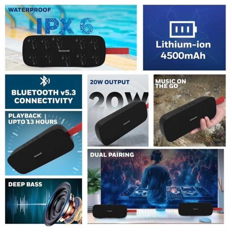 The Honeywell Trueno U300 is a powerful and versatile portable Bluetooth speaker designed for immersive audio anywhere. With 20W stereo output, dual 78mm drivers, and twin bass radiators, it delivers punchy bass and crystal-clear sound. Featuring Bluetooth 5.3, TWS pairing, multiple connectivity options, and a 4500mAh battery offering up to 13 hours of playtime, it’s ideal for both indoor and outdoor entertainment. Its IPX6 water resistance, built-in microphone, and 2-year manufacturer warranty make it a reliable companion for music, calls, and parties.