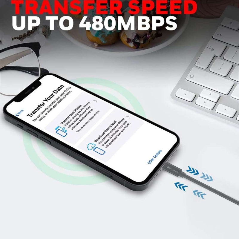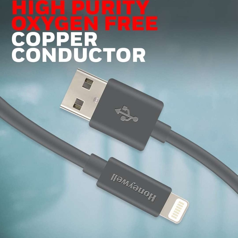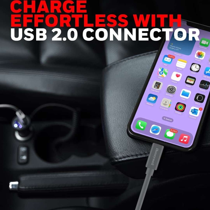 The Honeywell Apple Lightning Sync & Charge Cable is a durable, MFI-certified USB 2.0 cable designed for fast charging and reliable data transfer. Featuring a nickel-plated Lightning connector, it supports up to 2.1A output and data speeds of up to 480 Mbps. With a tangle-free matte finish and Ultra Flex technology, this cable is tested for long-lasting performance and is perfectly compatible with Apple devices from iPhone 8 onwards. Ideal for charging and syncing via wall chargers, car chargers, PCs, and power banks.