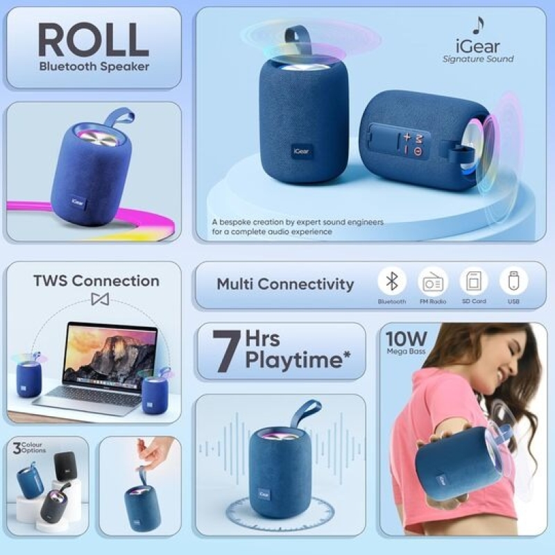 The iGear Roll 10W Bluetooth Speaker delivers an immersive 360-degree surround sound experience in a compact and stylish design. Powered by a 10W RMS output with an integrated bass radiator, it produces deep, clear audio from every direction. With up to 7 hours of playtime, IPX5 splashproof protection, and True Wireless Stereo (TWS) support, it’s perfect for indoor use, travel, and small gatherings. Touch controls and seamless Bluetooth connectivity make it easy to use with smartphones, tablets, and laptops.