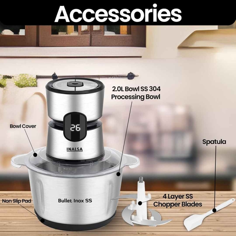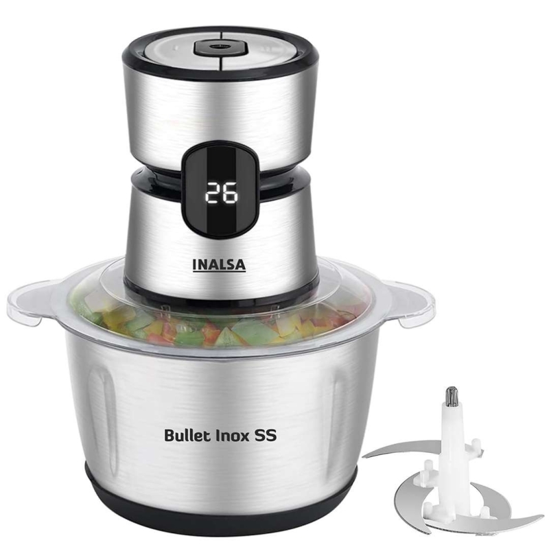 The INALSA Bullet Inox SS Electric Chopper is a high-performance kitchen appliance equipped with a powerful 500W pure copper motor, a 2L food-grade stainless steel bowl, and 4-layer stainless steel blades for precise chopping, dicing, mincing, and pureeing. Its digital timer display, 3-speed settings, and sleek stainless steel build make it an ideal choice for modern kitchens. With robust safety features and durable materials, it delivers efficiency, convenience, and longevity in every use.