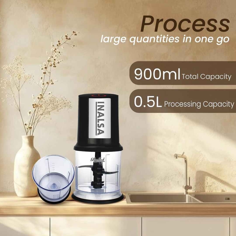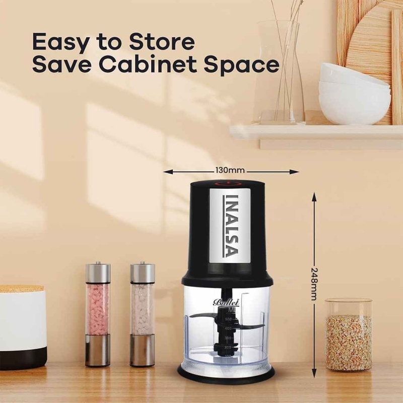 The INALSA Bullet Electric Chopper is a powerful, compact kitchen companion with a 400-watt pure copper motor and twin blade technology. Ideal for chopping, mincing, pureeing, and dicing, it features a 0.5L processing capacity, easy one-touch operation, and a durable ABS plastic body. Its anti-slip base, detachable stainless-steel blades, and dishwasher-safe bowl make it a convenient and reliable choice for everyday kitchen tasks. Backed by a 2-year warranty.