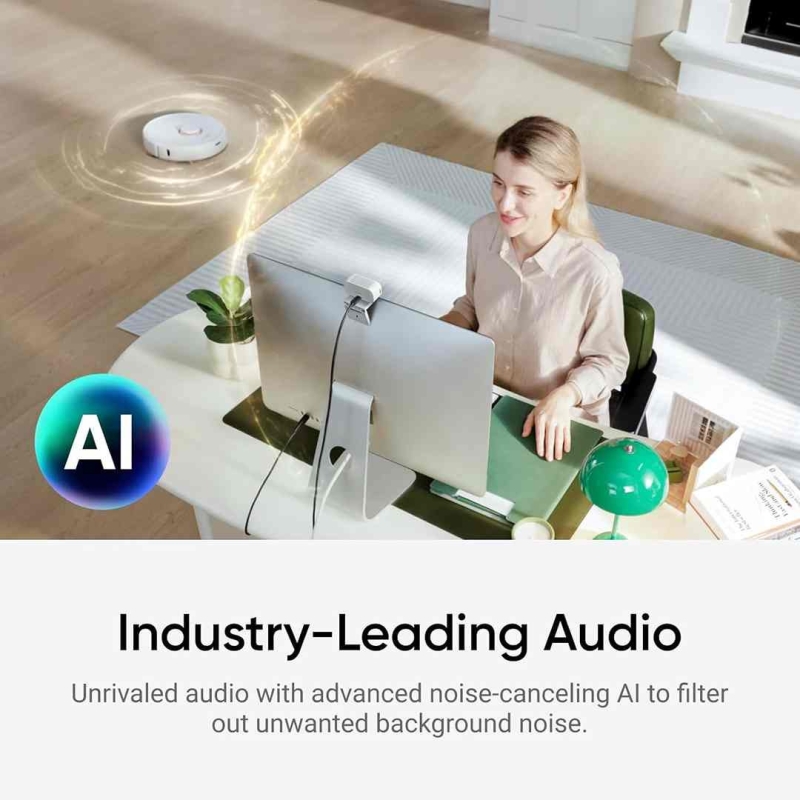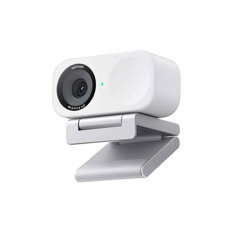 The Insta360 Link 2C is a white AI-powered 4K webcam with a 1/2" CMOS sensor for ultra-clear video and excellent dynamic range. It features AI tracking with gimbal rotation, automatic zoom and framing, multiple shooting modes (Whiteboard, DeskView, Overhead, Portrait), and dual noise-canceling microphones for crisp audio. Ideal for professional video calls, streaming, and online collaboration.