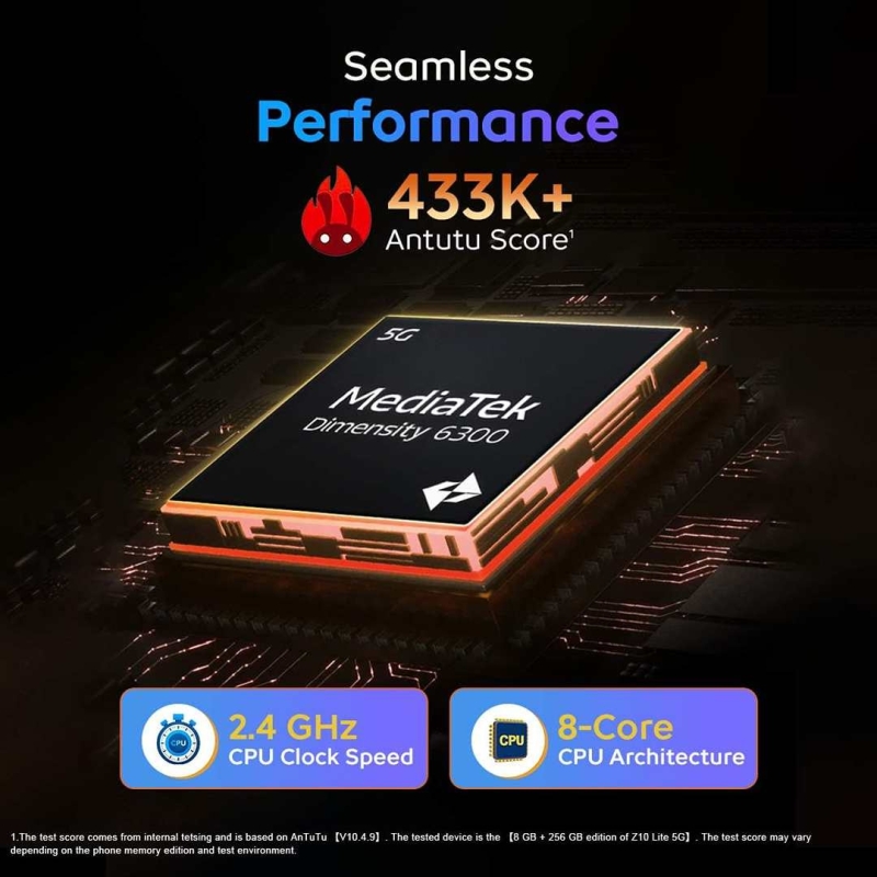 The iQOO smartphone features a powerful and efficient Dimensity 6300 5G processor, a massive 6000mAh battery with 15W FlashCharge, and a stunning 6.74-inch 90Hz display with 1000 nits brightness. Designed for durability with IP64 protection and military-grade shock resistance, it also comes with a 50MP Sony AI rear camera, advanced AI photography modes, and ample 128GB storage expandable up to 2TB. Perfect for entertainment, photography, and all-day usage.