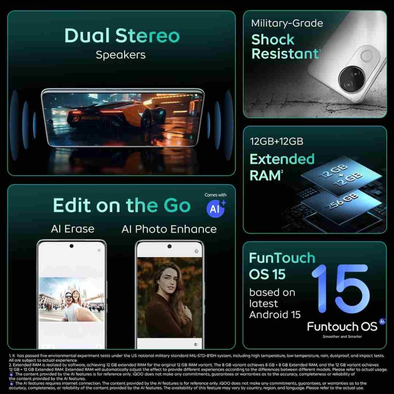 The iQOO smartphone features a powerful Dimensity 7400 5G processor built on an efficient 4nm process, delivering smooth performance with its 12GB RAM and 256GB storage. It sports India’s slimmest quad-curved 6.77" AMOLED display with a 120Hz refresh rate and 1800-nit brightness. With a 32MP 4K selfie camera, 50MP Sony IMX882 OIS rear camera, and multiple shooting modes, it excels in photography and videography. A large 5700mAh battery with 44W FlashCharge ensures all-day usage, while IP68/IP69 and military-grade durability provide robust protection.