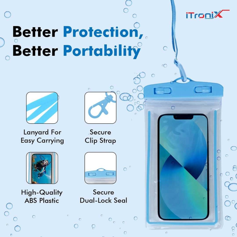 The iTronix Waterproof Mobile Pouch is a lightweight, universal waterproof case designed to protect smartphones up to 6.8 inches. With IPX8 certification (up to 10 meters), dual clear touch-sensitive windows, and a secure snap-lock with zip seal, it keeps your phone and valuables safe during swimming, beach trips, boating, and other water adventures. Comes with a neck strap for convenient, hands-free use.