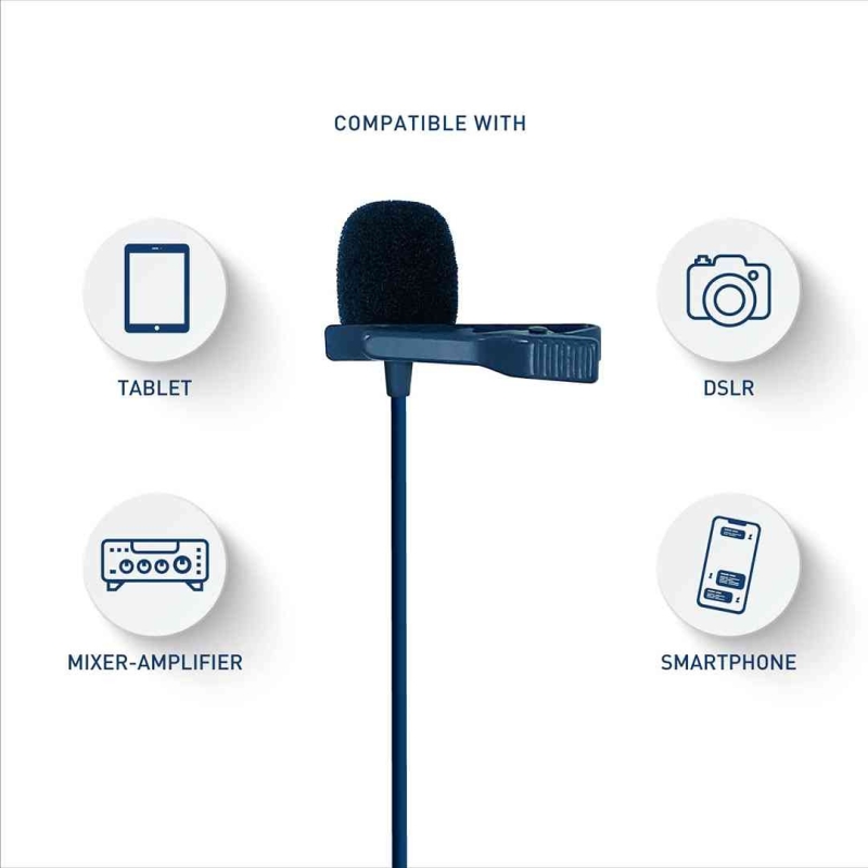 The JBL-CSLM20BBLU is a battery-powered omnidirectional lavalier microphone ideal for commercial use, including recording, podcasts, interviews, and vlogging. With a 3.5mm TRRS jack, 6-meter cable, and compatibility with smartphones, DSLR cameras, and mixer-amplifiers, it delivers clear audio with high sensitivity and low noise. The microphone comes with a tie-clip, windshield, adapter, and carry pouch for versatile use.