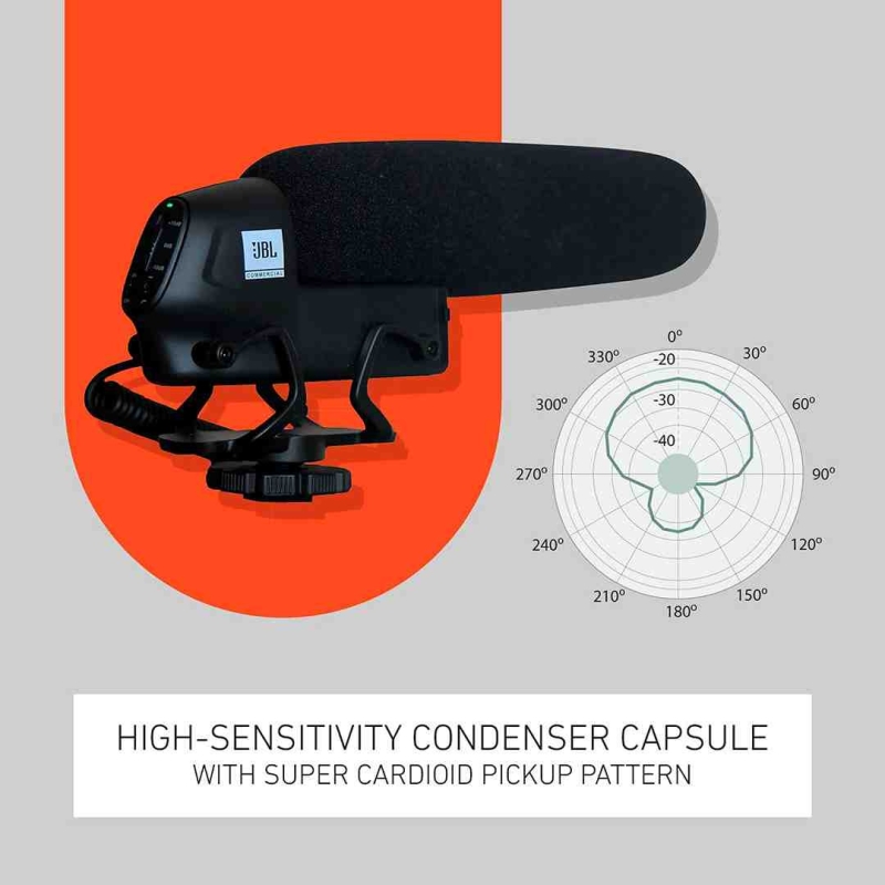 The JBL CSSG20 is a high-sensitivity, battery-powered on-camera shotgun condenser microphone ideal for commercial use such as vlogging, interviews, weddings, party videography, and news gathering. With a super-cardioid pickup pattern, adjustable gain, built-in high-pass filter, and integrated shock mount, it delivers clear audio while minimizing mechanical and vibrational noise. Its cold shoe mount ensures easy installation on cameras, DSLRs, or smartphones.