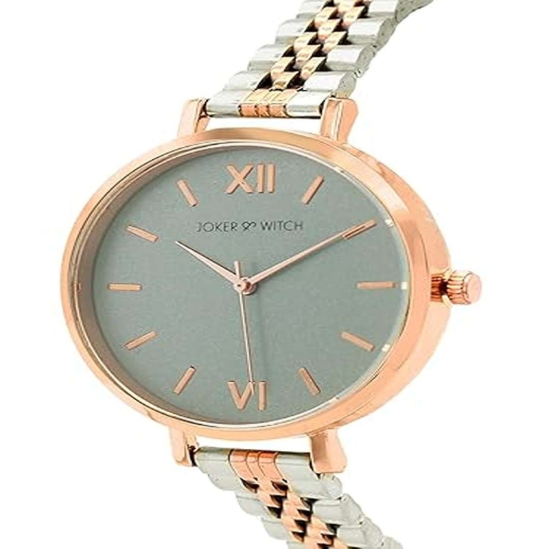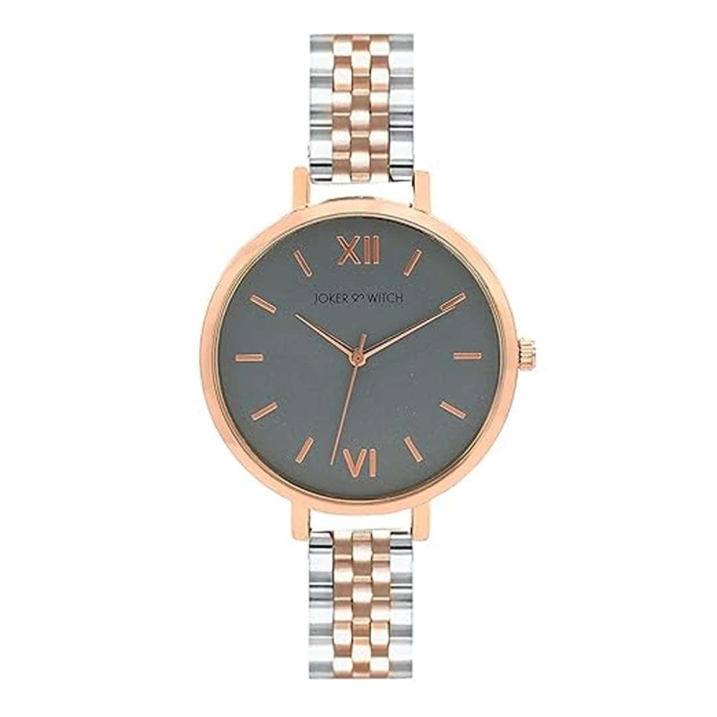 The Joker & Witch AMWW325 is a women’s casual analog watch featuring a 38 mm stainless-steel round case, black floral dial with minimalist rose-gold markers, a rose-gold stainless-steel link strap with deployment clasp, reliable quartz movement, and 30 m water resistance.