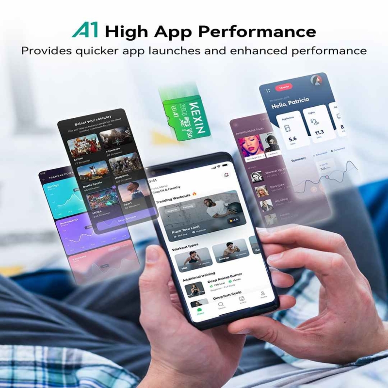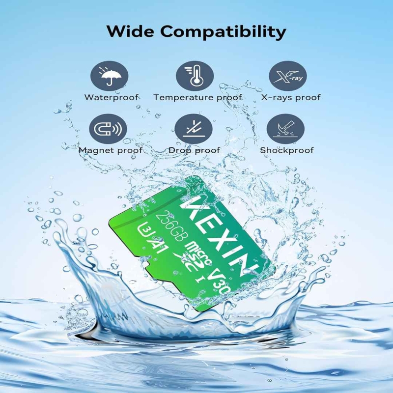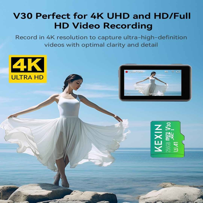 The KEXIN TF-U3-256G-KX-IN is a 256GB microSDXC card designed for high-performance storage with UHS-I U3, V30, and A1 certifications. With read speeds up to 90 MB/s and write speeds of 30 MB/s, it supports 8K HDR, 4K/120fps video, and Full HD recording. Built for durability, it is drop-proof, dust-proof, waterproof, and X-ray proof, compatible with cameras, smartphones, tablets, gaming consoles, drones, and dashcams.